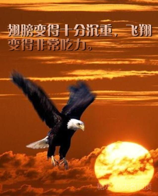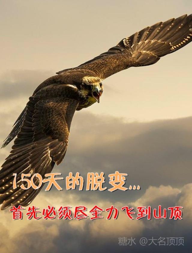 时髦老太太留言: 《鹰的重生》鹰很大气的在尉蓝色的天空展翅翱翔40年,要经受150天艰苦的煎熬蜕变喙,爪,羽毛的磨难,战胜自己仍继续翱翔在广阔天30年时光。人的一生要想活出个样来就要选择坚强,坚持,不辞劳苦战胜艰难与挫折,奋斗到光彩耀人,实现梦想小康水平。这美格激发人的斗志!我喜欢这正能量美格!大赞!!