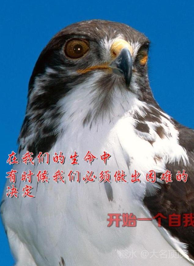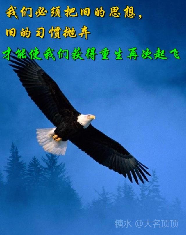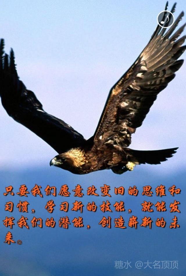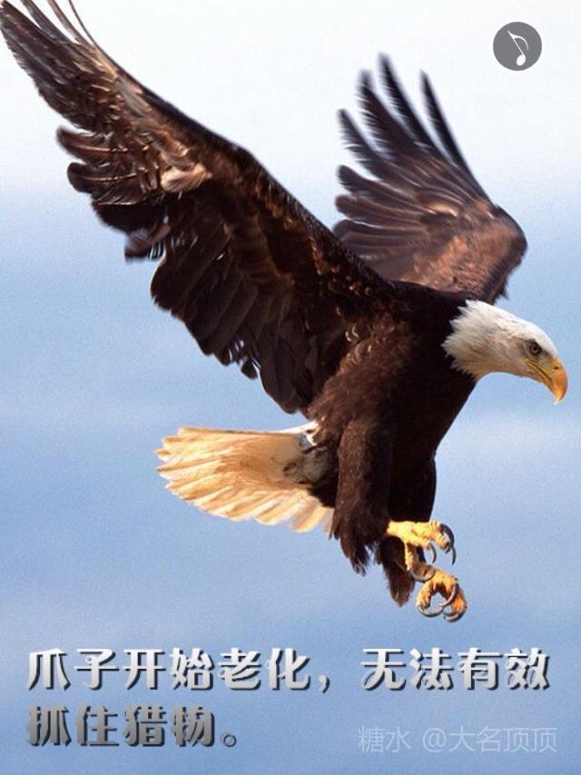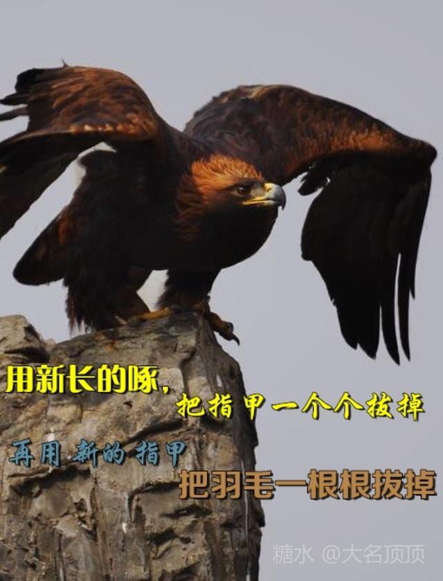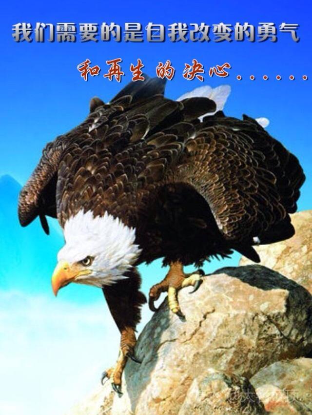 蕙质兰心留言: 《鹰的重生》鹰是世界上生命最长的鸟类。鹰能展翅翱翔,它的重生却十分痛苦,经历慢长的岁月。看到了鹰就看到了我们自己。在我们生活中有时候我们必须做出困难的决定。需要自我改变的勇气,学习新的技能,就能发挥我们的潜能,创造新的未来。活出自己的人生,内心要强大,一切都强大,向新的生活迈进。为励志格图点赞!