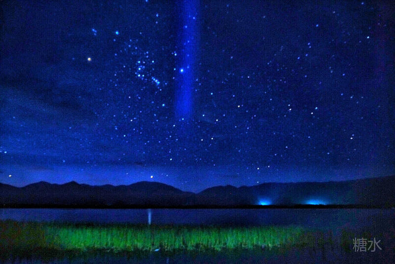 不行,在露台上拍感觉视野还是不够宽,于是扛起脚架,穿上外套,轻手轻脚打开门,下楼。 嘿,客栈大门居然留了个小门,可能是知道游客有拍星空的。走出客栈,来到湖边一块空地。