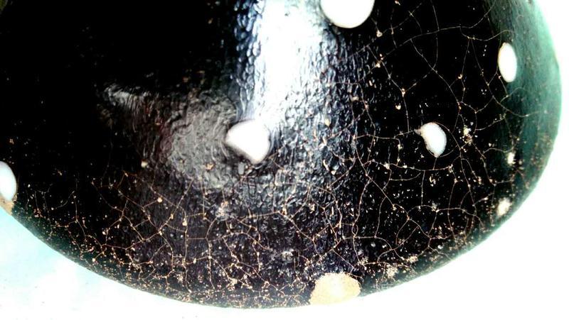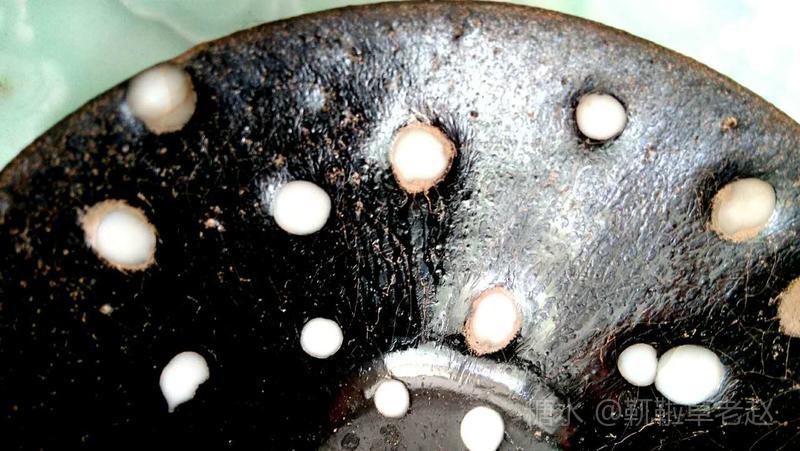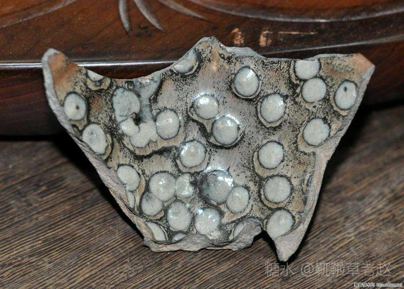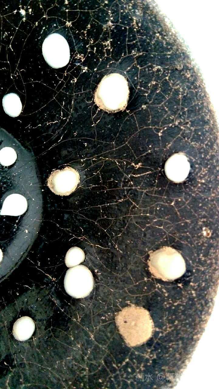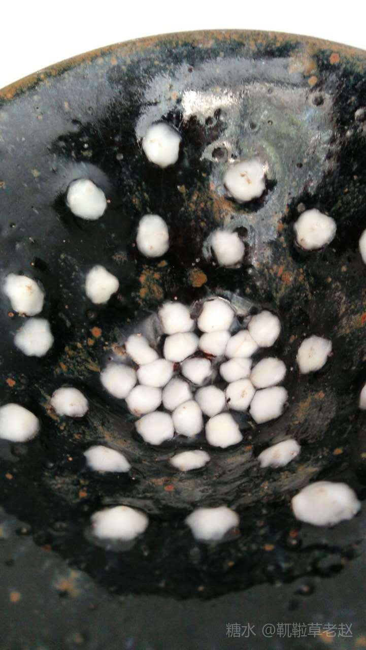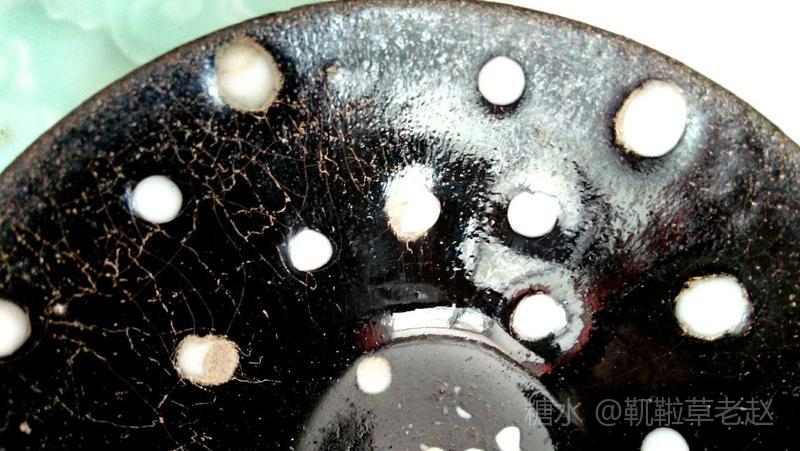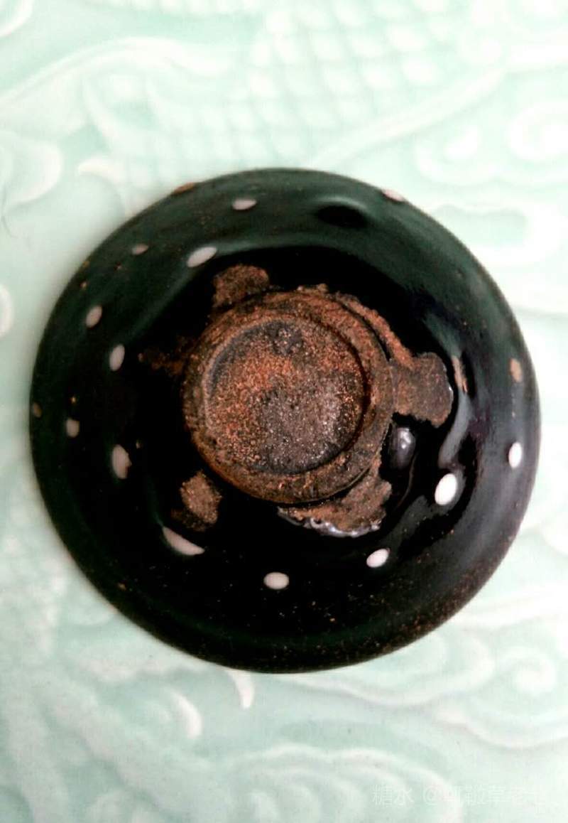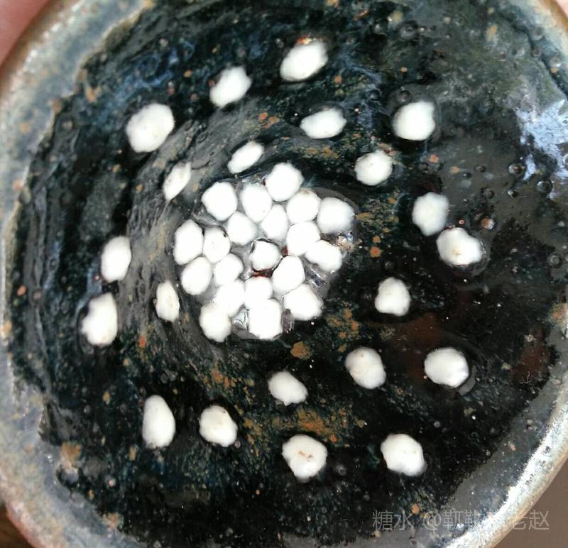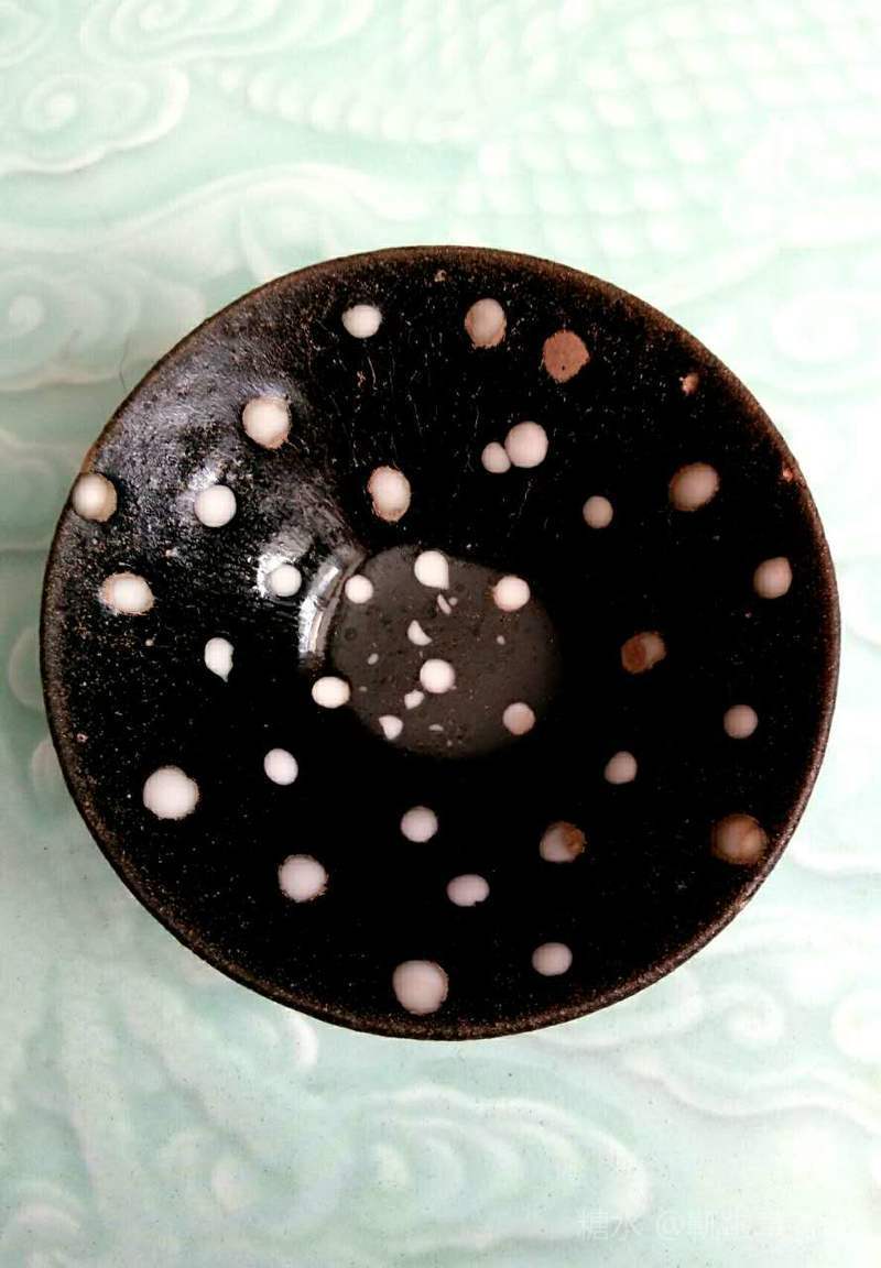 建窑珍珠斑茶盏也叫鹧鸪斑茶盏,珍珠斑属于点彩釉,始于宋代。由于珍珠班烧制条件非常苛刻,所以在宋代建窑黑釉茶盏中较为罕见。此类茶盏在日本被称为“天目瓷“,并列为无价之国宝。 由图片可见,珍珠斑(鹧鸪斑)是在黑色釉地上有点点凸起的白釉斑,看上去如洒落的珍珠或如鹧鸪胸前白色圆斑羽毛,珍珠班或鹧鸪斑的名字就是由此而来的。陶谷所著的《清异录》中亦有”闽中建盏,花纹斑鹧斑点,试茶家珍之”的记载。 建盏珍珠斑亦即鹧鸪斑的烧制工艺分为两种:一种是茶盏上釉后在烧制过程通过窑变产生白色斑点,纯属“天作之合”,据说此种建盏仅日本和美国博物馆各收藏了一件;第二种是在上好的黑釉上点上白釉,并通过烧制形成黑地白点的茶盏。上面两只珍珠斑茶盏和福建省博物馆珍珠斑茶盏残片均属于此种制品。此种珍珠斑茶盏的工艺特征是白色的斑点有凸出釉面,更有立体之感。无论哪种工艺,珍珠斑的烧制是极为困难的,可以说宋代珍珠斑茶盏不仅得之不易,甚至难得一见。近年,市场上也可见仿制的鹧鸪斑建盏,但如东施效颦,一眼可辨。 值此中秋佳节,鄙人献丑捧出两只珍珠斑茶盏给各位亲朋好友敬茶,以暗喻中秋佳节阴阳相济、好事成双、百年好合、幸福美满、花好月圆!