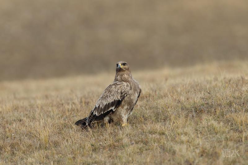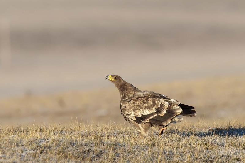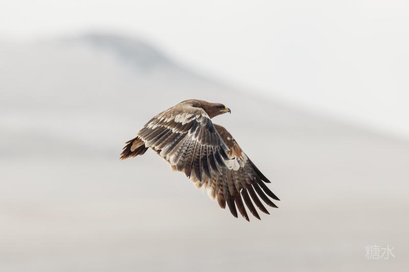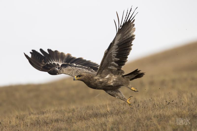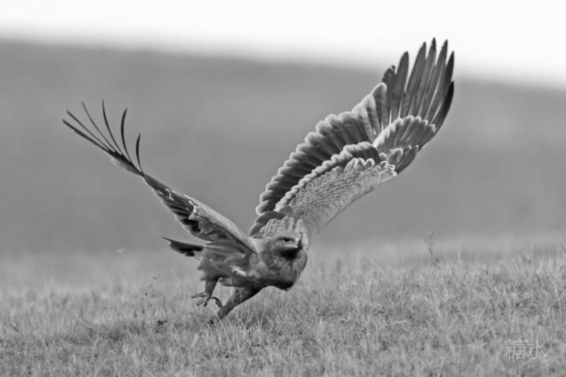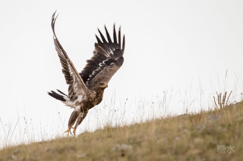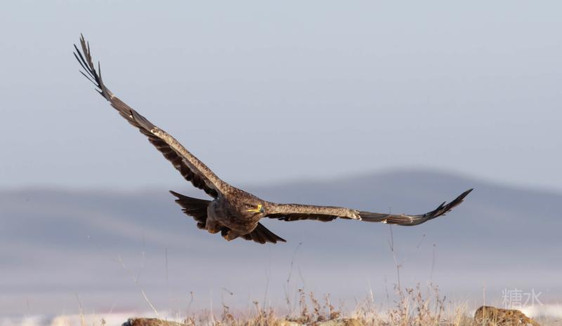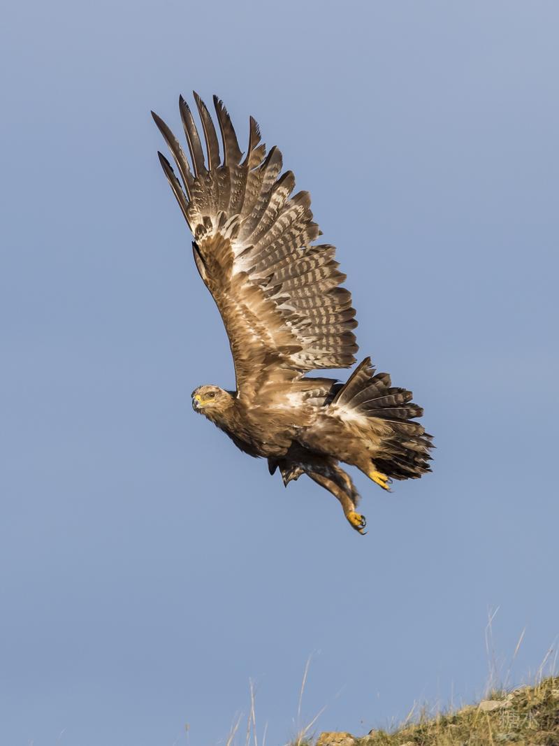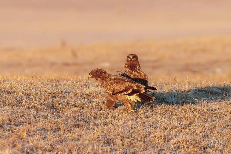 后来有经验的鸟友说、不用急、早上去拍草原雕一般不要离它太近就能拍好、因为鸟身体上羽毛有湿气、如果没有风、飞起来比较吃力...