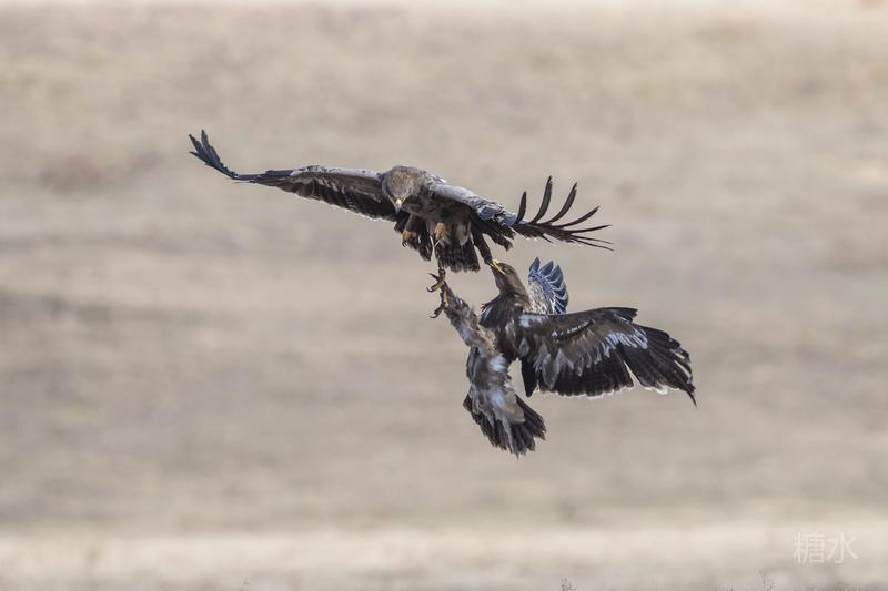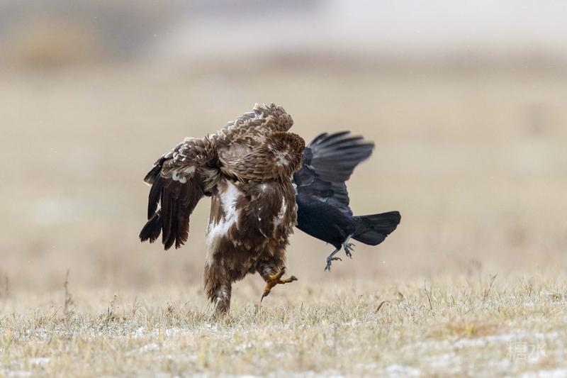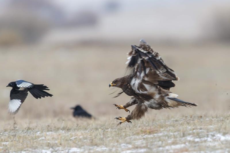 上面是乌鸦、下面那只喜鹊也是准备时刻着偷袭、叼它的尾巴毛、很有耐力、没完没了、草原雕生气了也没什么好办法、喜鹊、乌鸦都是群体活动、少的时候几只、多的时候十几只、甚至更多都来参加战斗、...很好笑!草原雕真的离开了、它们也打、鸟为食亡可能就这么来的...