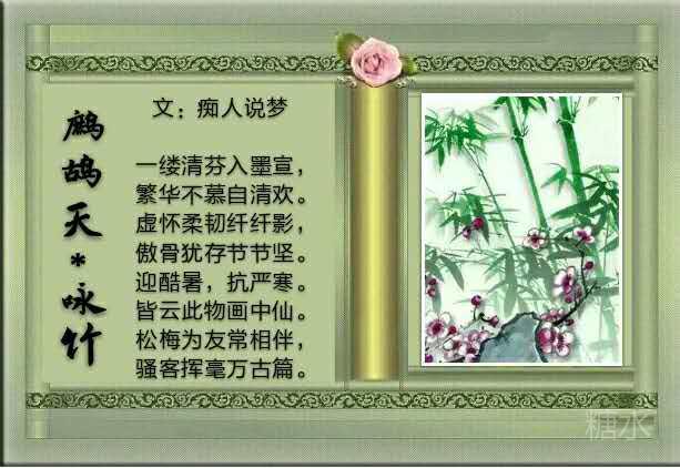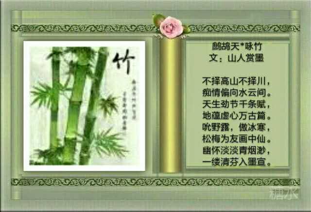 七律,咏松 文:山人赏墨 凌霜沐雪三冬翠,却有浓荫展绿营。 万壑风摇云影动,千山月照鹤声鸣。 天生劲骨骚人赋,地蕴雄心雅士耕。 待到他年成砥柱,金龙盘凤走雕楹。 七律·咏竹 文:山人赏墨 亮节凌云贯九重,葱葱一片沐寒风。 虚心不与花争艳,傲骨偏同雪斗雄。 雅士铺笺流墨韵,将军引箭射苍穹。 松梅为伴成三友,共把清芬送彩虹。 七律【咏竹】 文:痴人说梦 流青滴翠展娇妆,瘦影婆娑幻影长。 可与幽兰同雨露,也和晚菊共冰霜。 风摇嫩指邀云梦,月隐苍竿任雪狂。 酷暑严寒皆不惧,虚心傲骨气轩昂。 鹧鸪天《咏竹》 文:山人赏墨 不择高山不择川,痴情偏向水云间。 天生劲节千条赋,地蕴虚心万古篇。 吮野露,傲冰寒,松梅为友画中仙。 幽怀淡淡青烟渺,一缕清芬入墨宣。 鹧鸪天【咏竹】接龙 文:痴人说梦 一缕清芬入墨宣,繁华不慕自清欢。 虚怀刚韧纤纤影,傲骨犹存节节坚。 迎酷暑,抗严寒。皆云此物画中仙。 松梅为友常相伴,骚客挥毫万古篇。