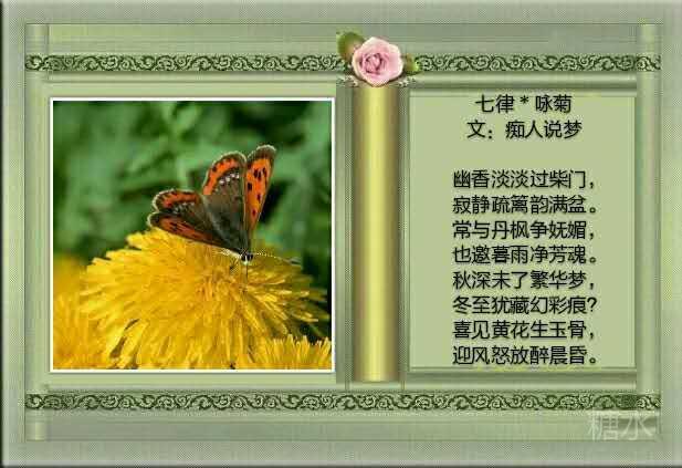 七律 《菊赞》 文/山人赏墨 披霜吐蕊倚柴门,几簇娇花绽玉盆。 谢尽群芳生傲骨,掬来雅韵著诗魂。 仙姿凝重邀云笔,濡墨含香染画痕, 摘取菊中三两叶,酿成美酒醉晨昏。 七律《咏菊》 文/痴人说梦 馨香一缕醉晨昏,倩影娇姿溢满盆。 自是清高生雅韵,犹怀玉骨恋诗魂。 凝霜沐雨蜂无迹,伴月吟风画有痕。 待到初冬飞雪日,依然俏媚绽朱门。 七律《咏菊》接龙 文:山人赏墨 依然俏媚绽朱门,寂寞东篱种满盆。 沐雨经风生傲骨,凌霜吐蕊染冰魂。 娇姿摇雪迷三径,瘦影吟秋画一痕。 翰墨疏狂窗外景,多情伴我醉晨昏。 七律《咏菊》 文:痴人说梦 幽香淡淡过柴门,寂静疏篱韵满盆。 常与丹枫争妩媚,也邀暮雨净芳魂。 秋深未了繁华梦,冬至犹藏幻彩痕? 喜见黄花生玉骨,迎风怒放醉晨昏。