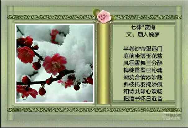 七律【赏梅】 文:痴人说梦 半卷纱帘望远门,庭前坐落玉花盆。 风徊雪舞三分醉,梅绽香盈已沁魂。 嫩蕊含情添妙趣,斜枝托羽掩娇痕。 和诗共咏心欢畅,把酒书怀日近昏。 七律 【咏梅】 文:山人赏墨 天生丽质厌朱门,独绽深山不羡盆。 喜与竹松成掣友,羞和芍药论冰魂, 仙姿楚楚增诗韵,瘦影昭昭留画痕。 唯有多情枝上雪,馨香一缕醉晨昏。