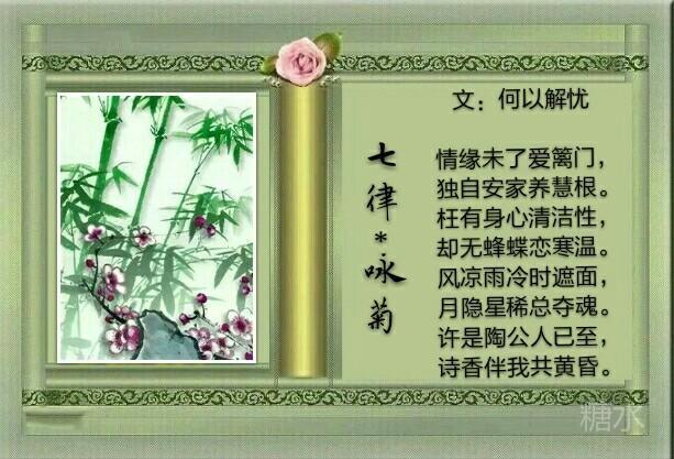 七律 * 吟菊 文:何以解忧 情缘未了爱篱门,独自安家养慧根。 枉有身心清洁性,却无蜂蝶恋寒温。 风凉雨冷时遮面,月隐星稀总夺魂。 许是陶公人已至,诗香伴我共黄昏。 七律 * 雪 文:何以解忧 昨夜纷飞梦正牵,今晨瑞气笼丰年。 临窗尽赏云中色,过槛平铺路上毡。 守信何妨情切切,如期至此爱绵绵。 从来浩宇知人意,一片冰心落九天。