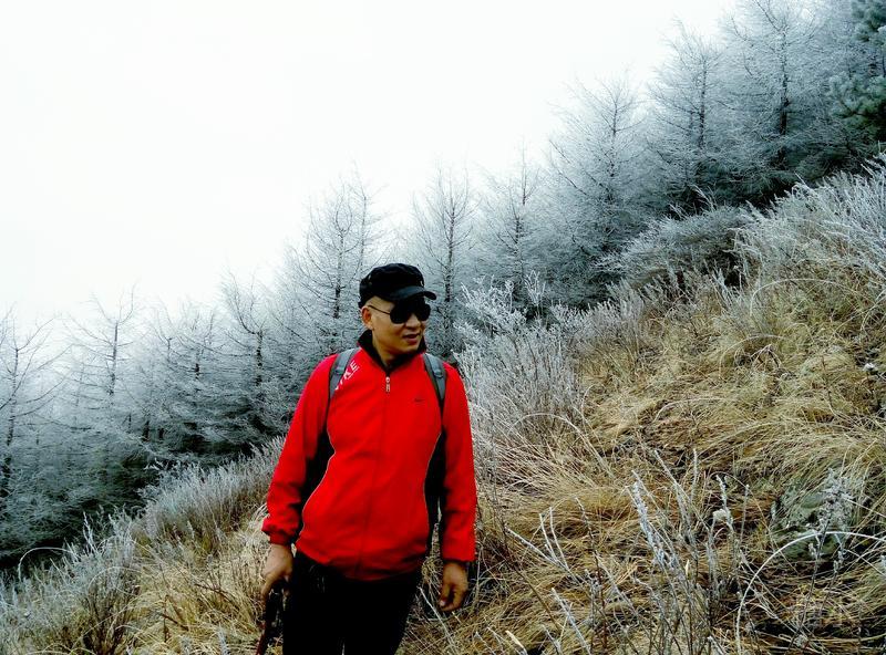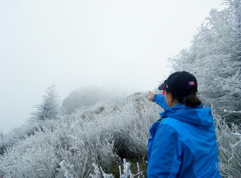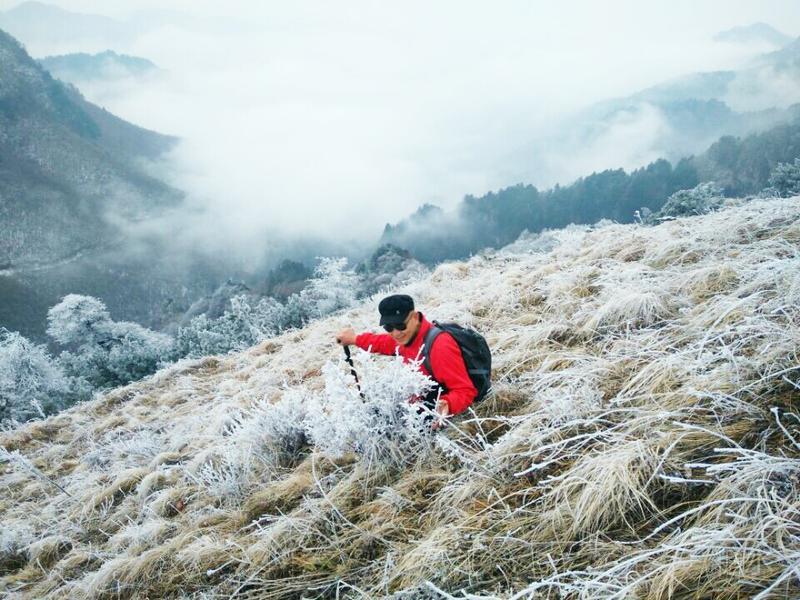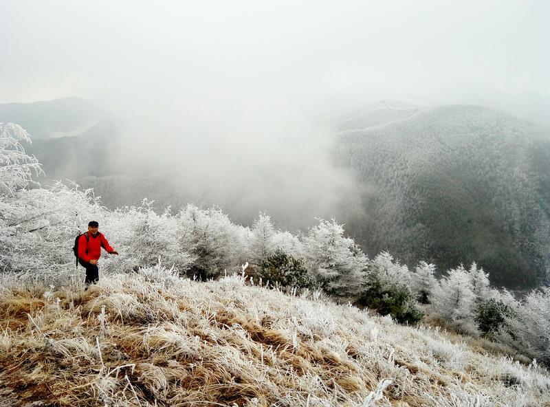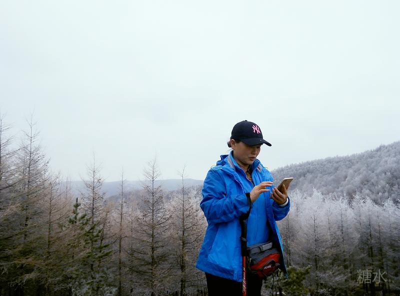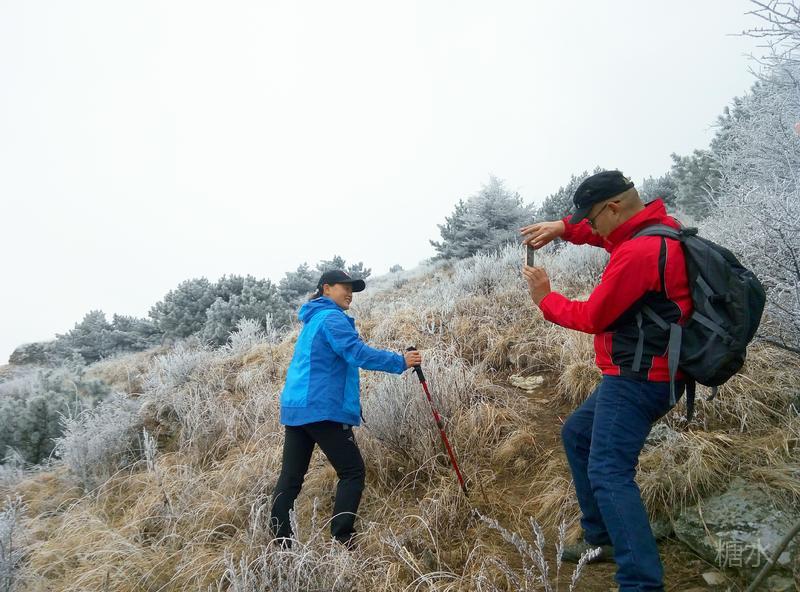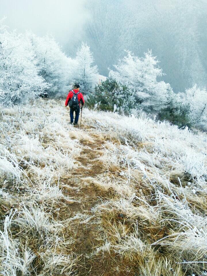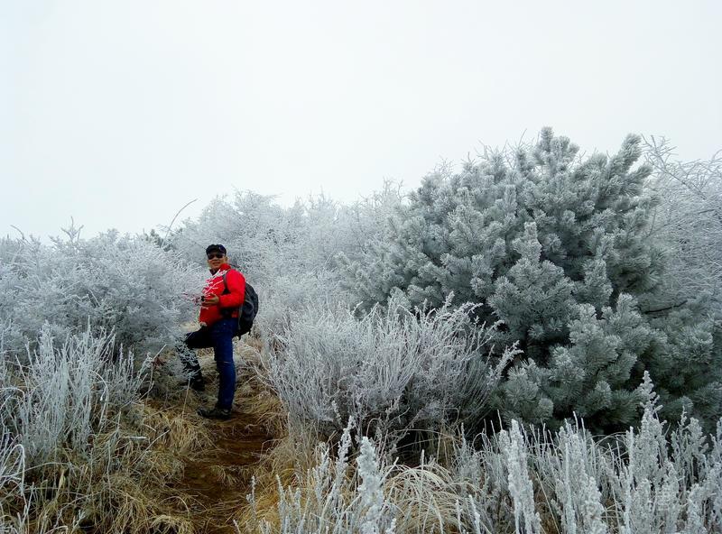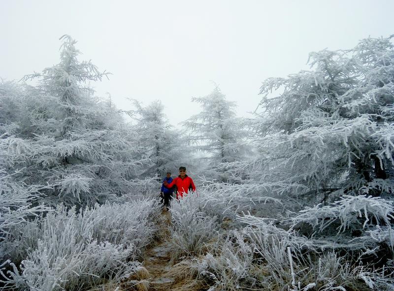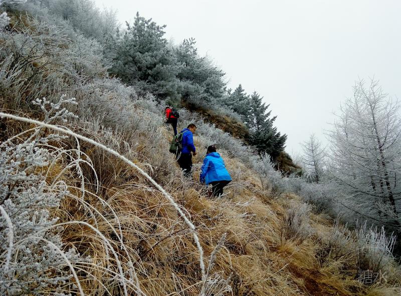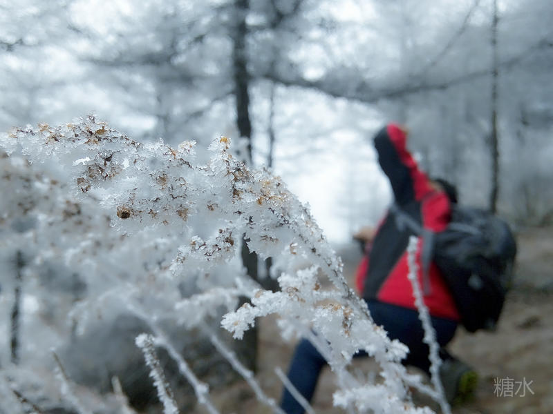 攀爬途中,随着海拔升高,气温下降,树挂也渐渐多了。