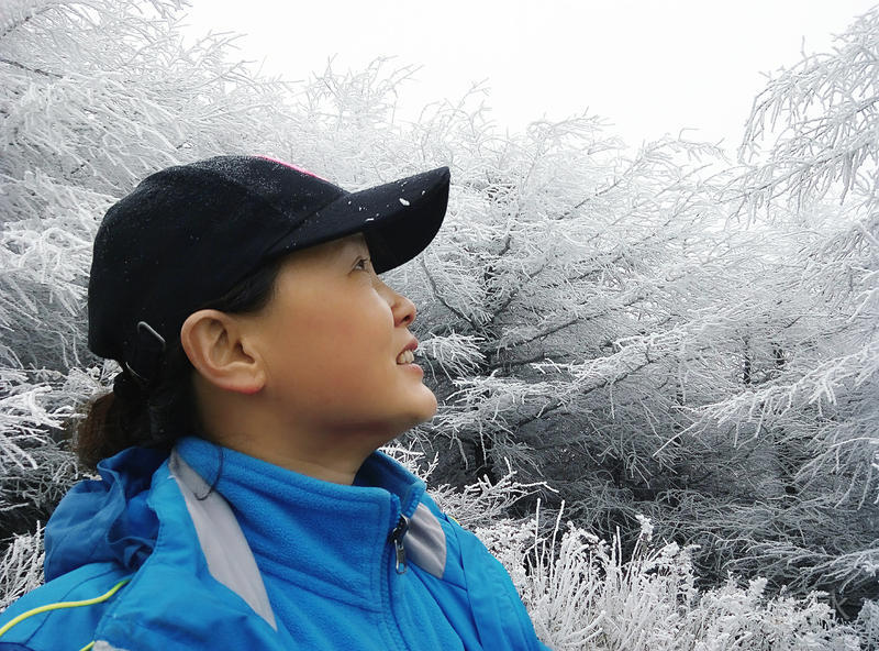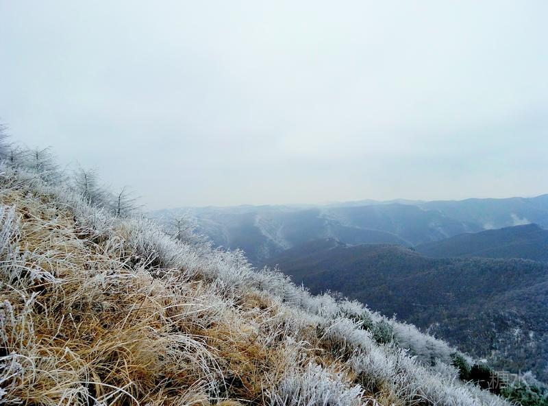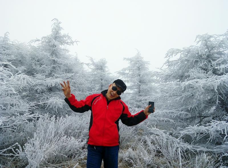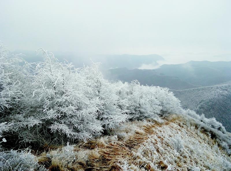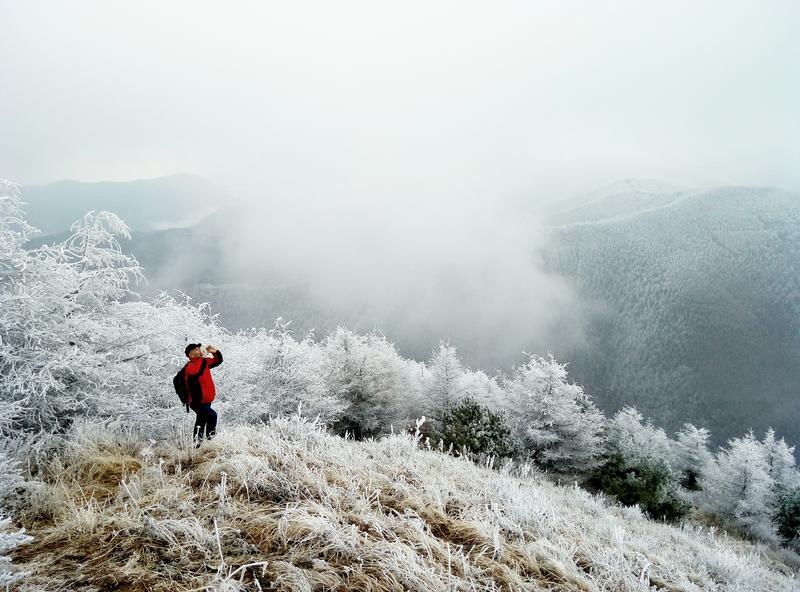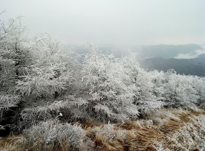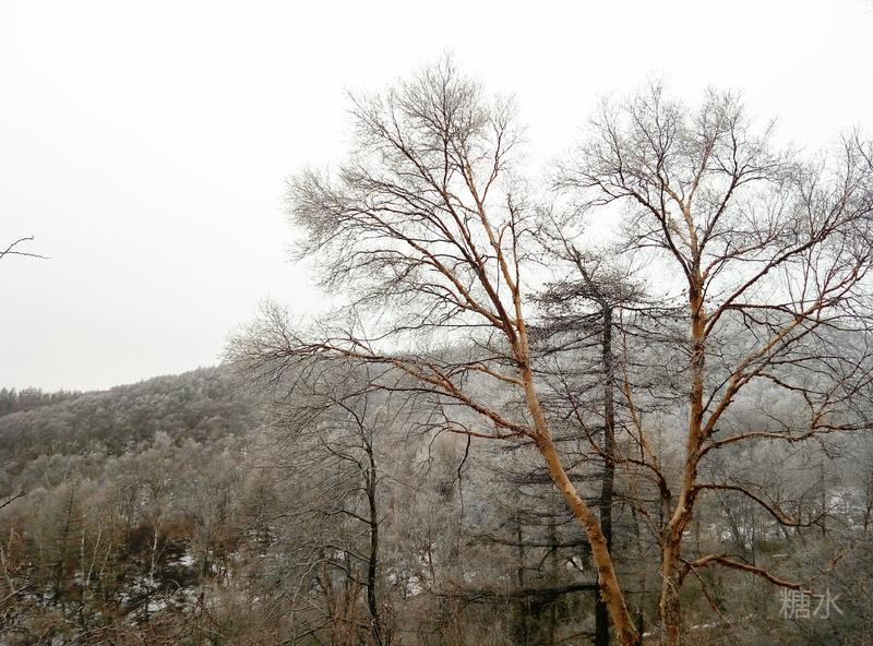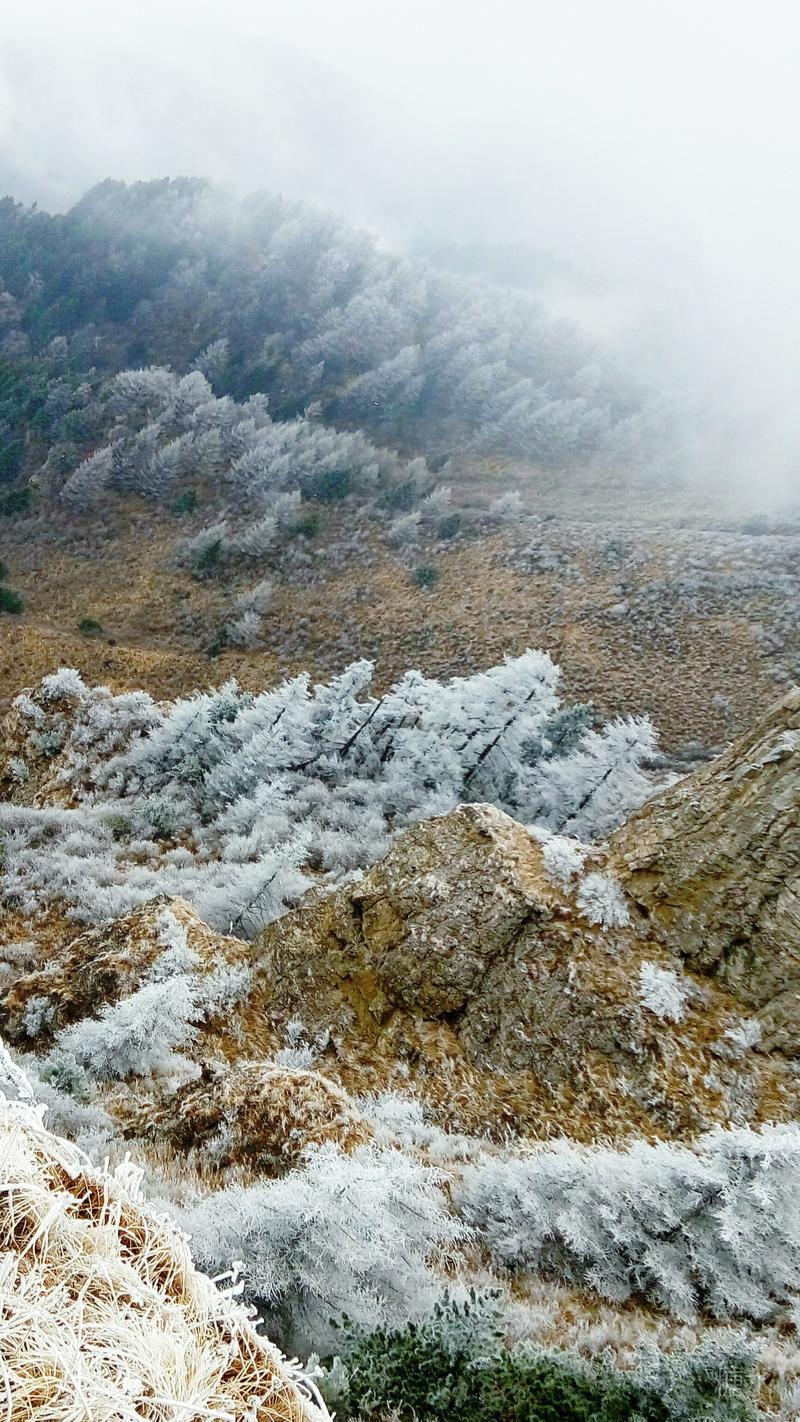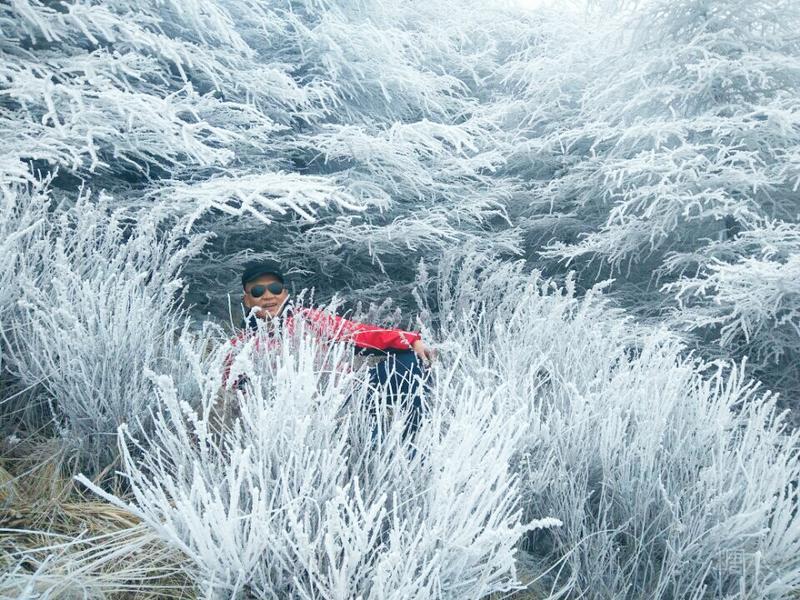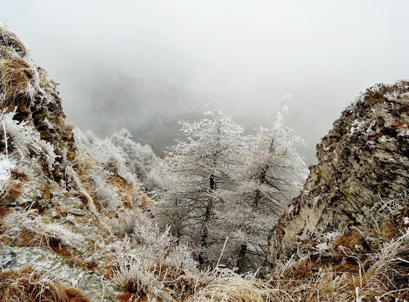 攀爬途中,随着海拔升高,气温下降,树挂也渐渐多了。