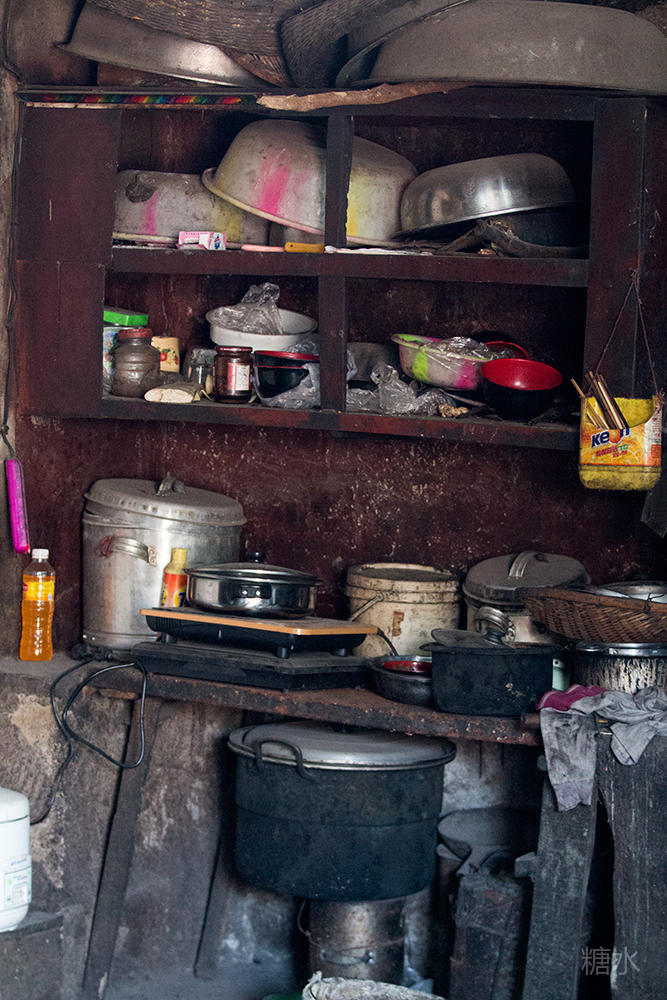 环顾四周,屋里光线昏暗,一位中年妇女在一旁忙着针线活,她是老师傅的老伴儿,屋角一个柜子里摆放着生活用品,还有其它打铁工具。