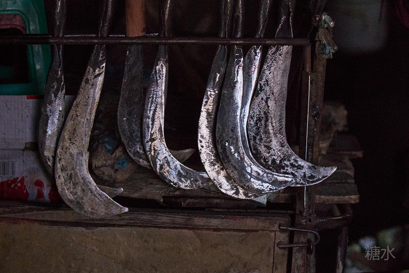 铁匠铺已经打制好的农具整齐地挂在架子上
