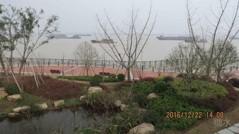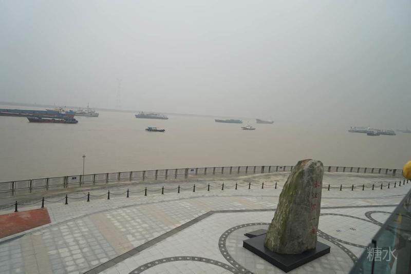 出了长兴横沙港区的边门,进入“长江第一滩”景区,保安让我们的车停在景区门口一侧,还代为看管,好人。图为俯瞰长江第一滩石碑和江景。