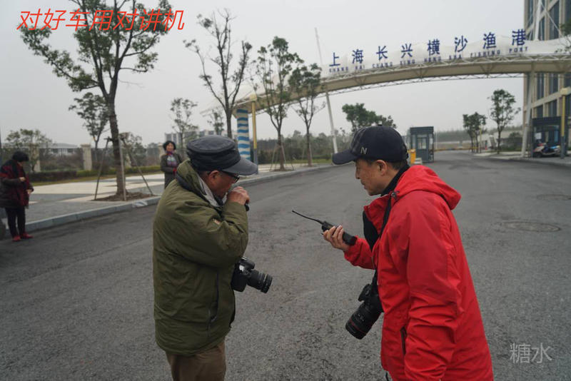 在长兴横沙港口大门前,还在试用联络用的对讲机。