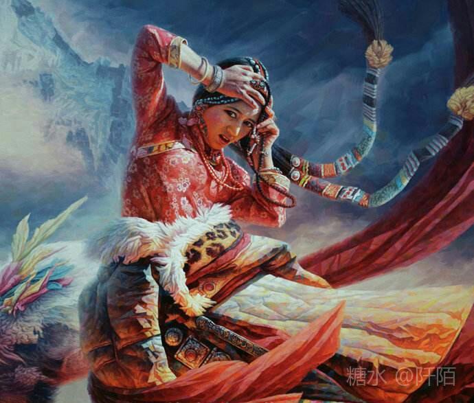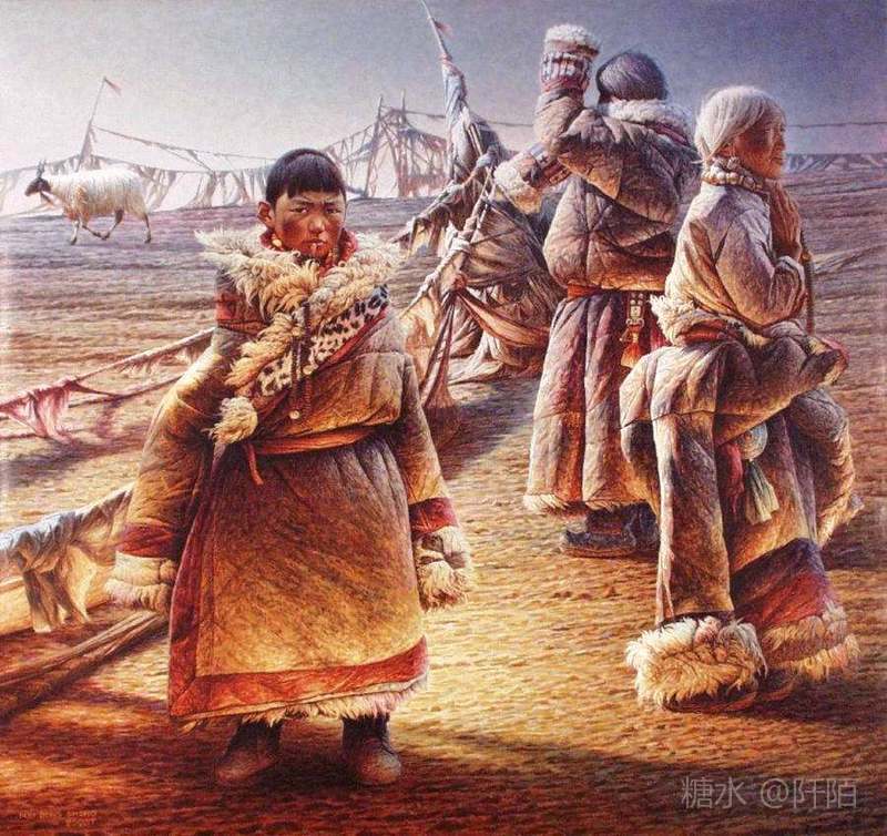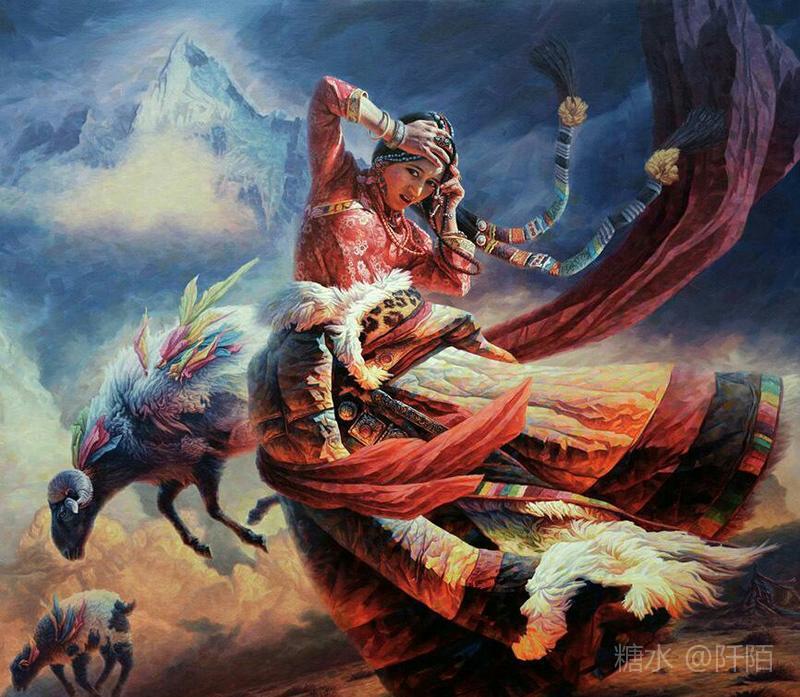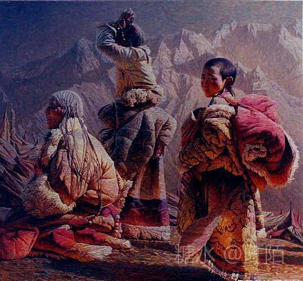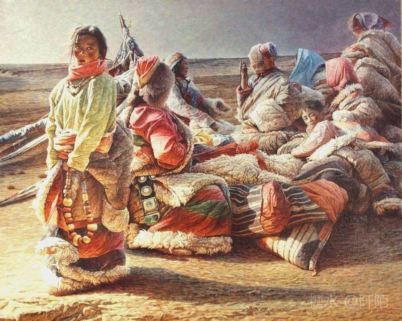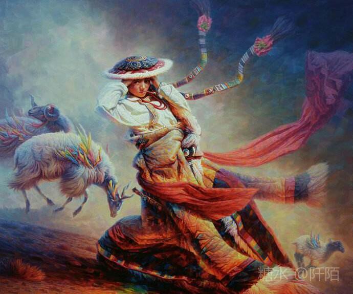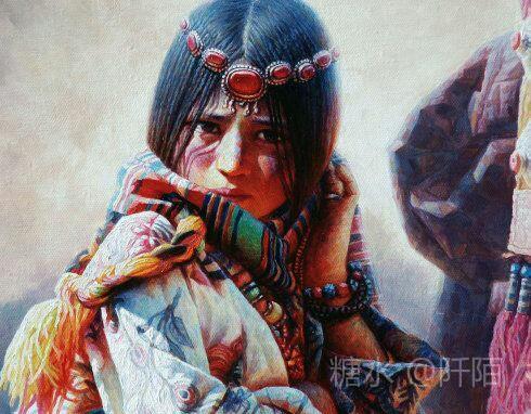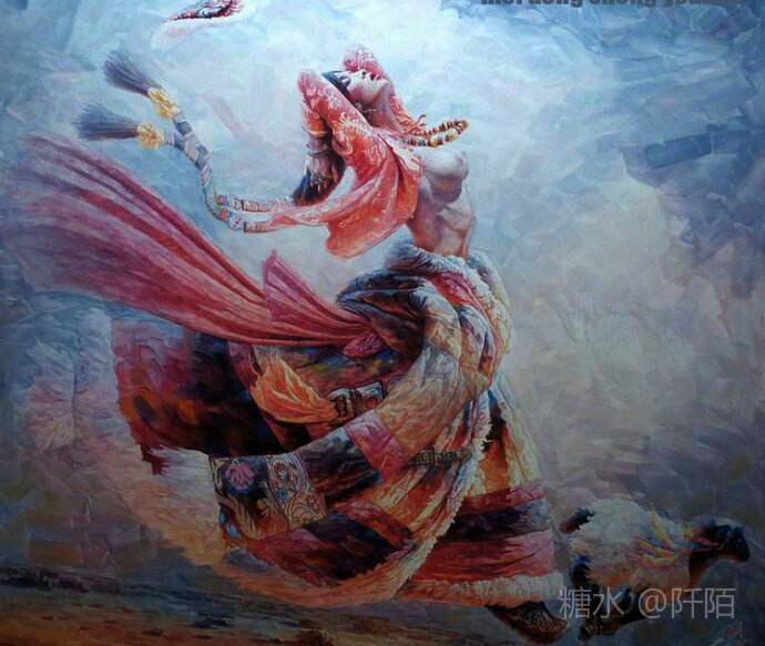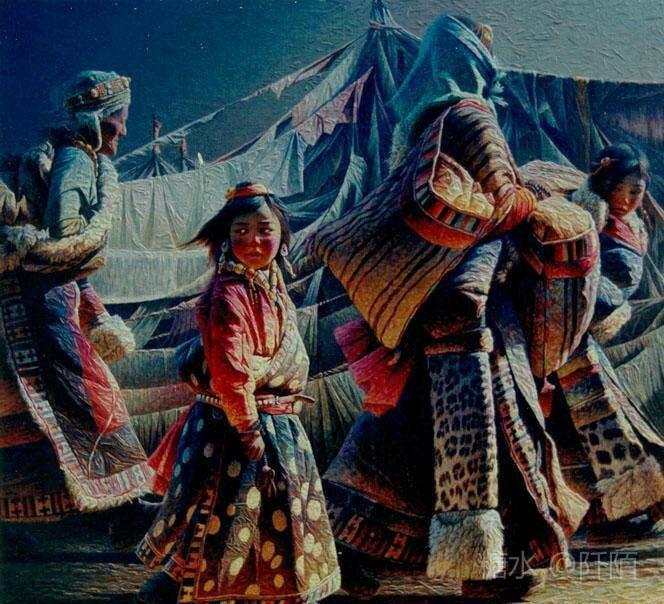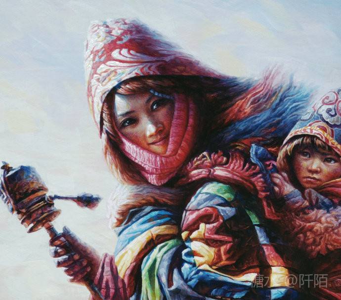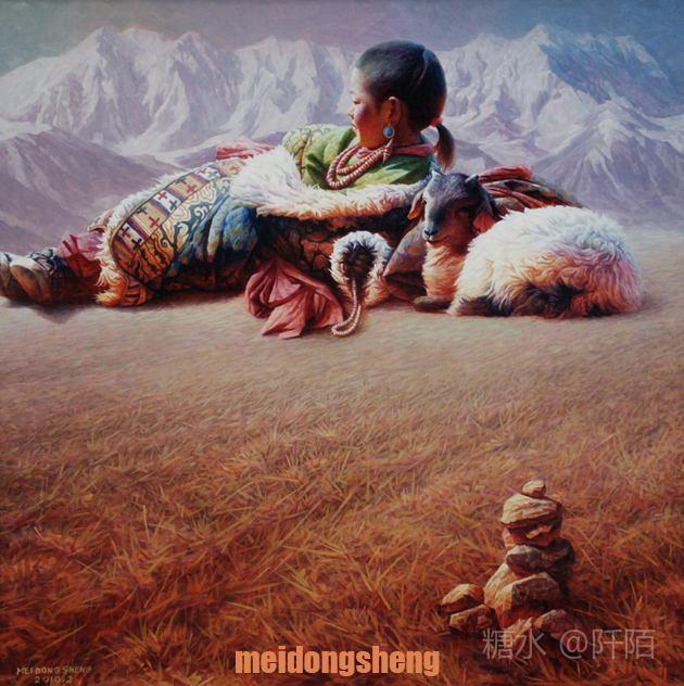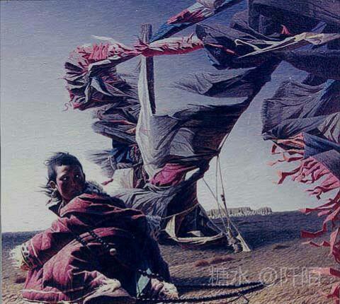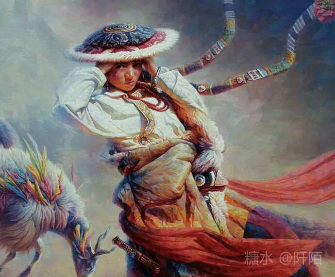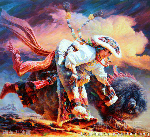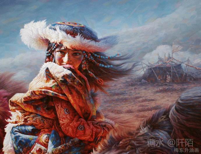 此前也读过艾轩、陈丹青等大师们画的西藏人物画,梅东升笔下的藏人油画与前者的静态相比,一. 他画中的人物大多盛装出场,色彩明快了许多,多用蓝、红,甚至朱红,增强了视觉冲击力; 二. 整个画面中的各个元素都在飘,在飞扬,你看高原的风吹起了一切,是一种裹携着绚烂色彩的跳动,画中充满动感,充满张力。这是作者的艺术夸张,却在情理之中,不感突兀。梅画传递给我们的信息,是一个生机勃勃的西藏。