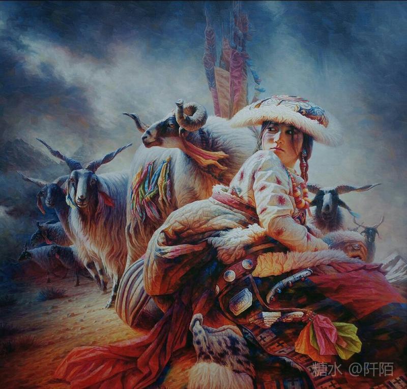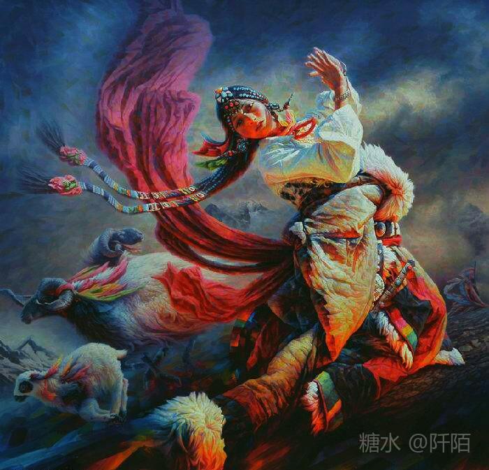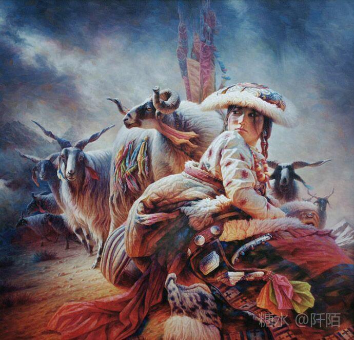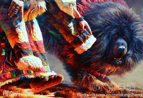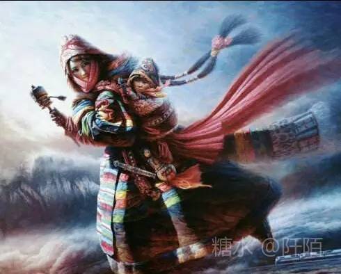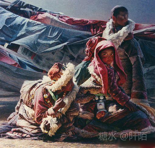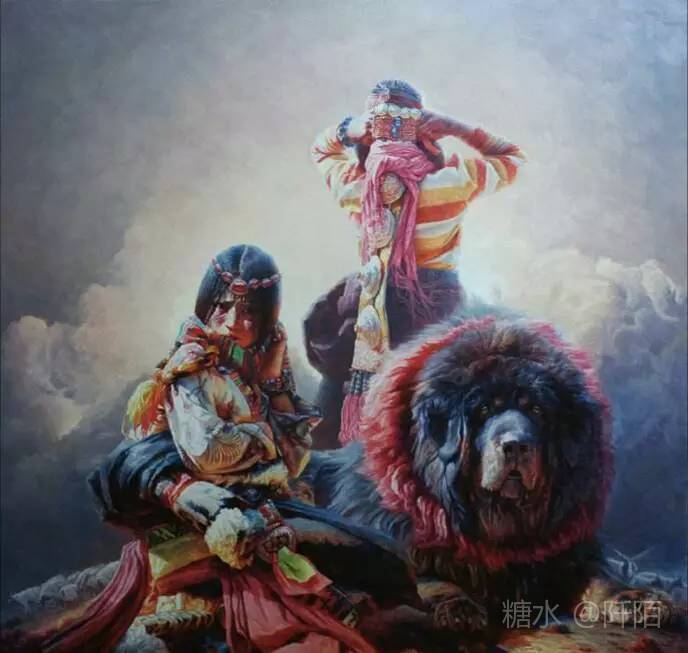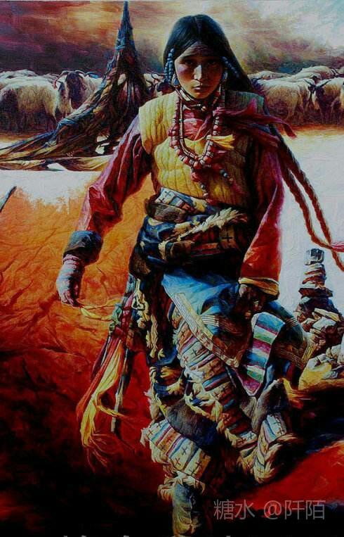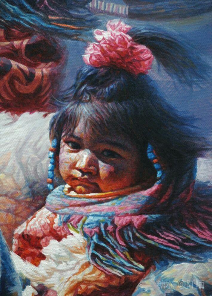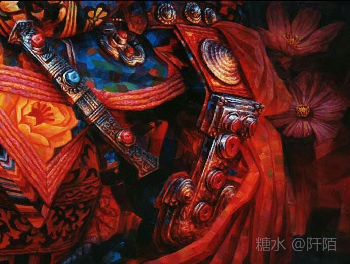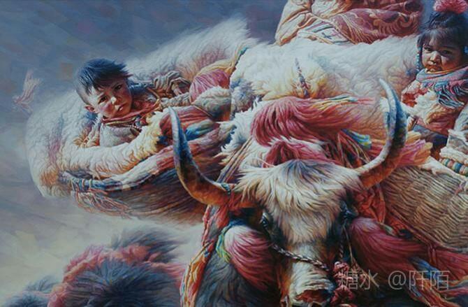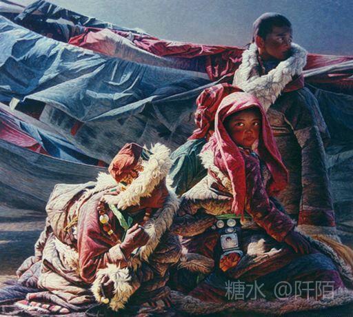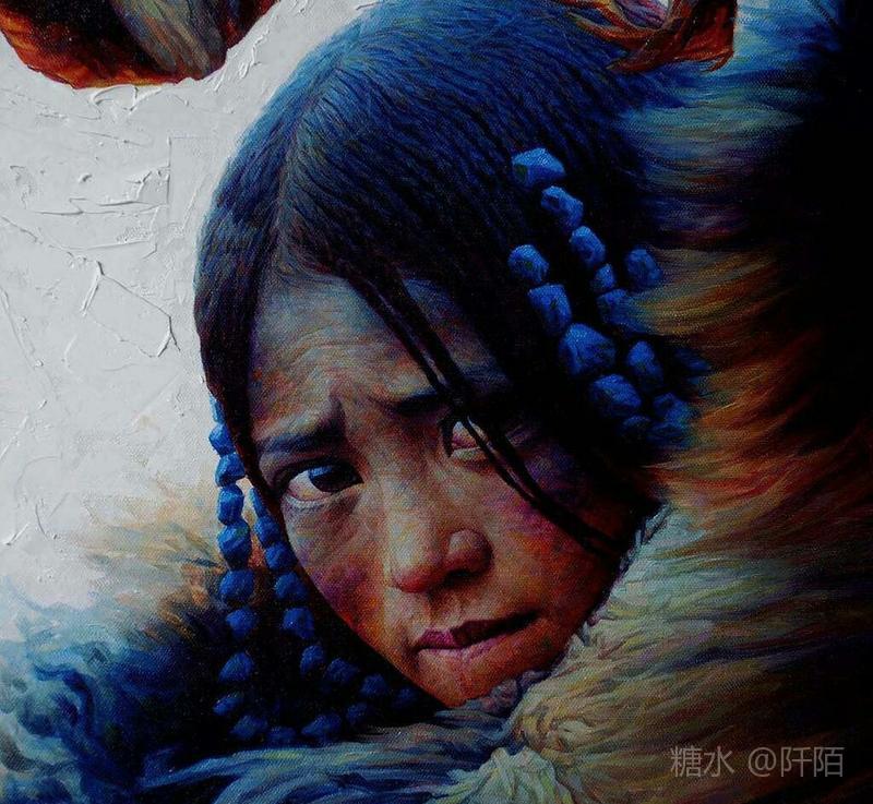 此前也读过艾轩、陈丹青等大师们画的西藏人物画,梅东升笔下的藏人油画与前者的静态相比,一. 他画中的人物大多盛装出场,色彩明快了许多,多用蓝、红,甚至朱红,增强了视觉冲击力; 二. 整个画面中的各个元素都在飘,在飞扬,你看高原的风吹起了一切,是一种裹携着绚烂色彩的跳动,画中充满动感,充满张力。这是作者的艺术夸张,却在情理之中,不感突兀。梅画传递给我们的信息,是一个生机勃勃的西藏。
