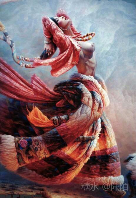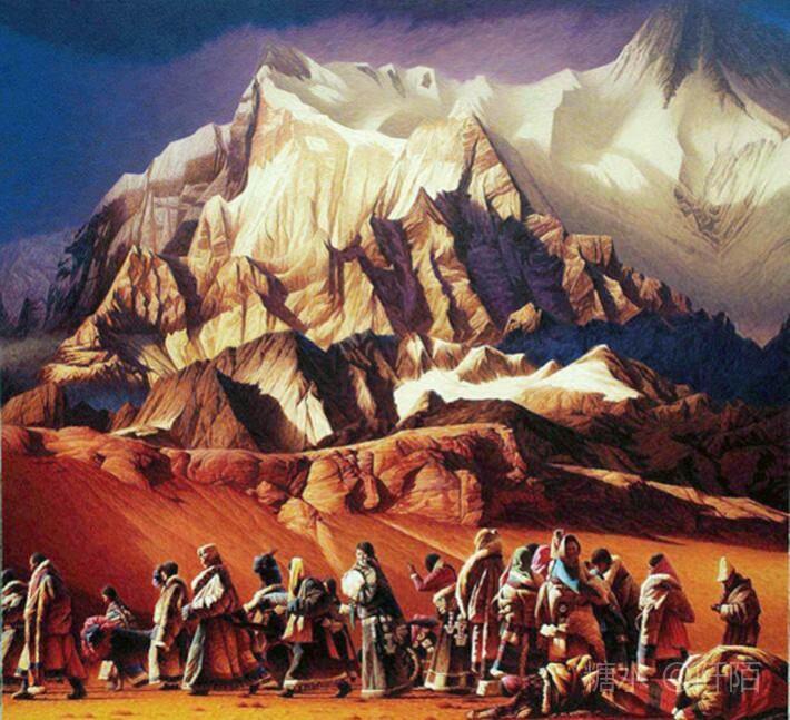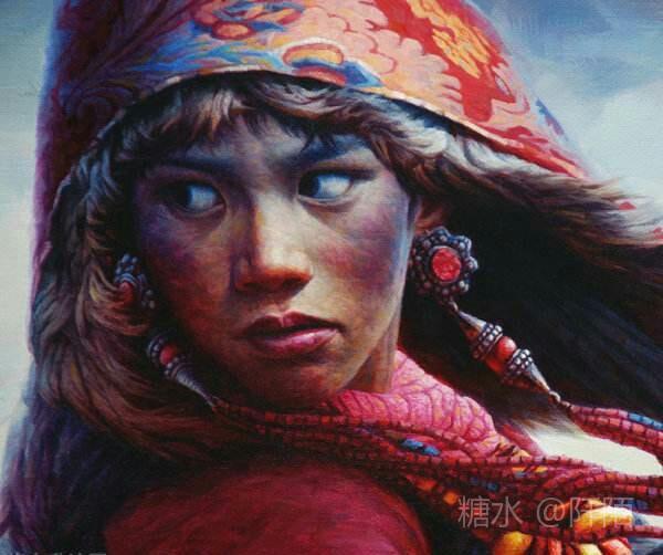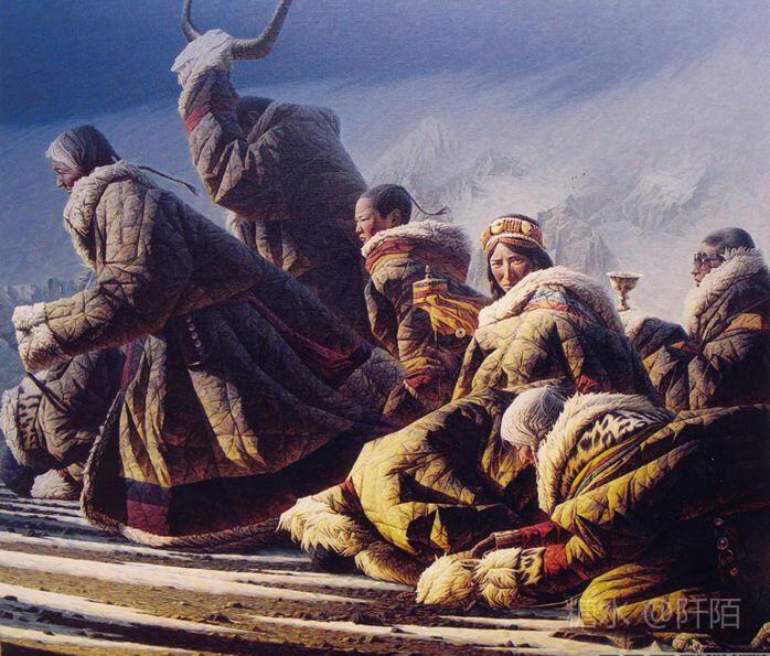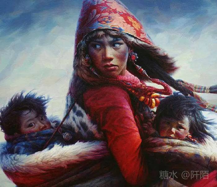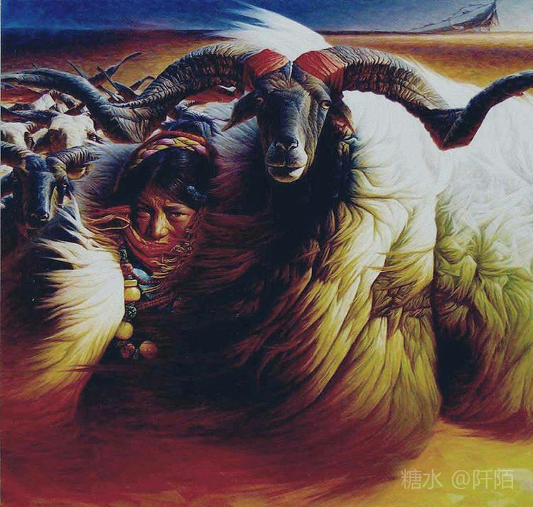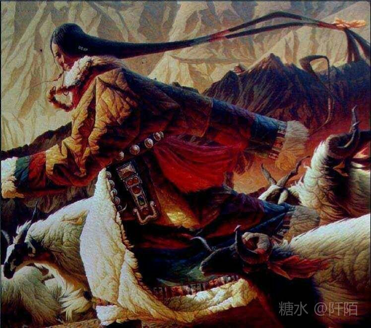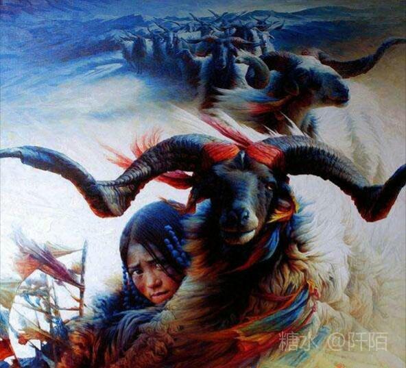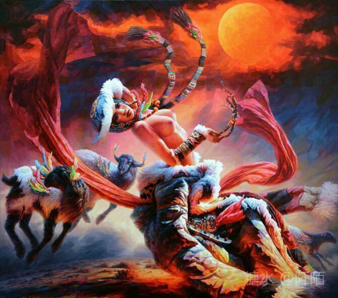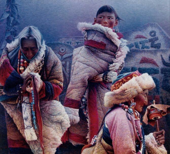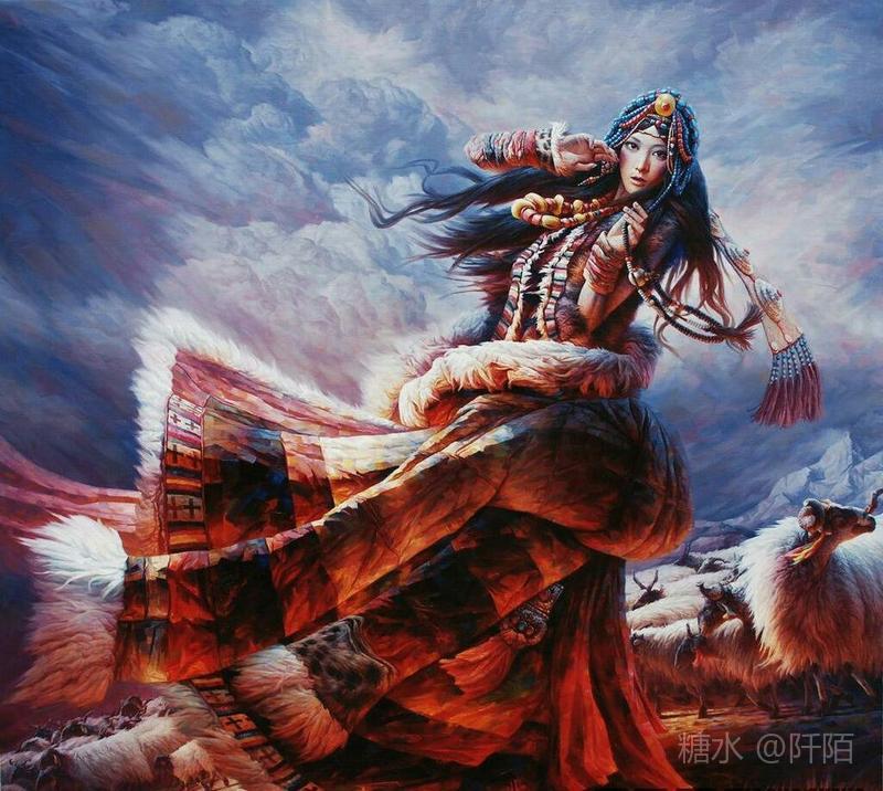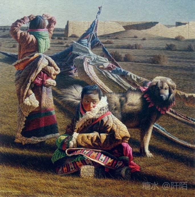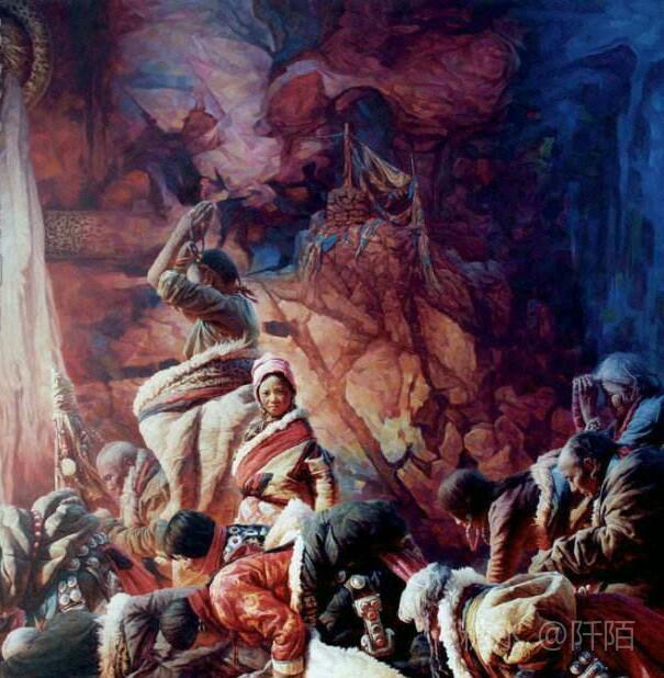 此前也读过艾轩、陈丹青等大师们画的西藏人物画,梅东升笔下的藏人油画与前者的静态相比,一. 他画中的人物大多盛装出场,色彩明快了许多,多用蓝、红,甚至朱红,增强了视觉冲击力; 二. 整个画面中的各个元素都在飘,在飞扬,你看高原的风吹起了一切,是一种裹携着绚烂色彩的跳动,画中充满动感,充满张力。这是作者的艺术夸张,却在情理之中,不感突兀。梅画传递给我们的信息,是一个生机勃勃的西藏。
