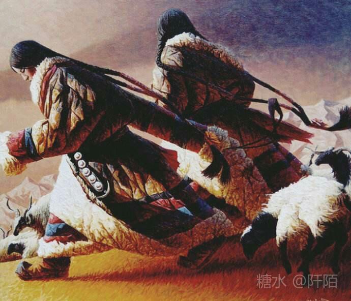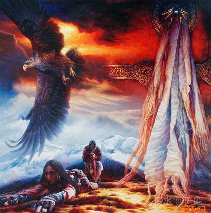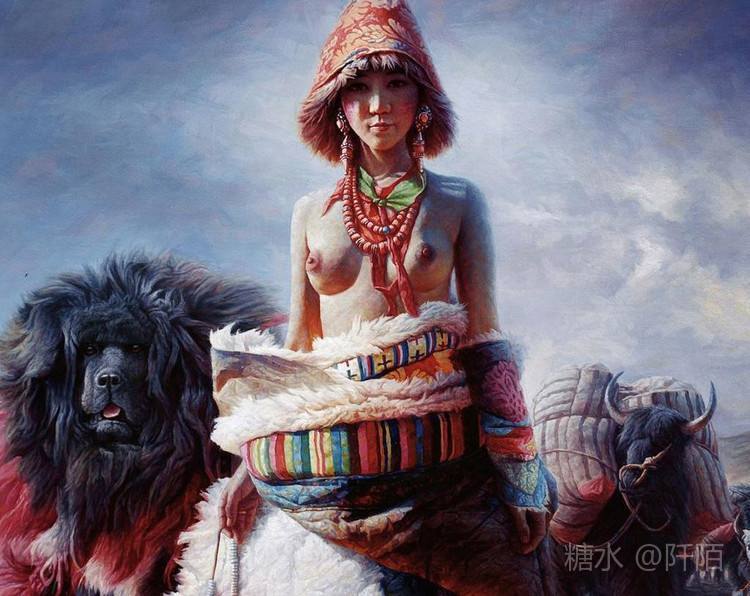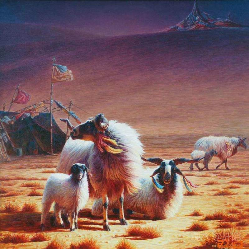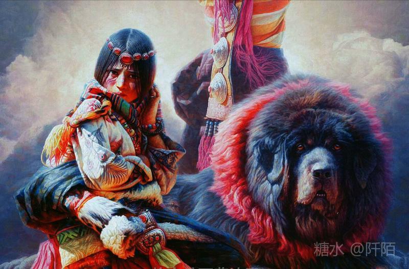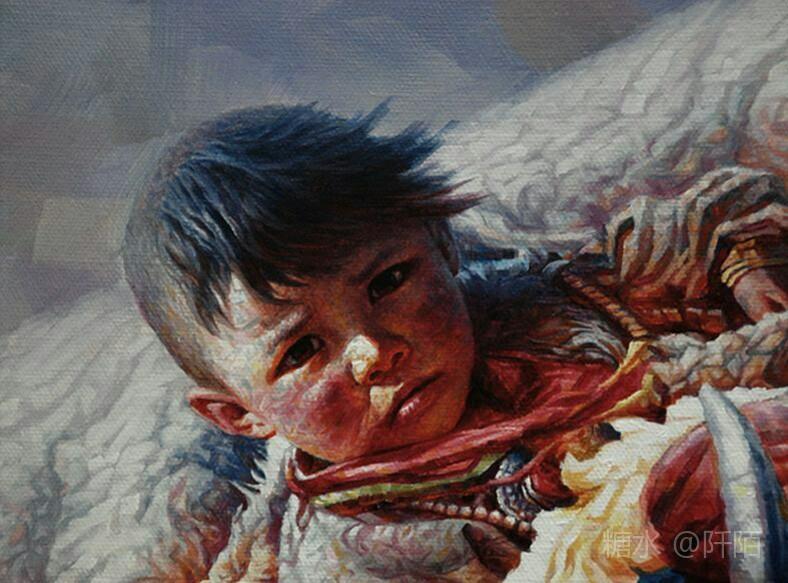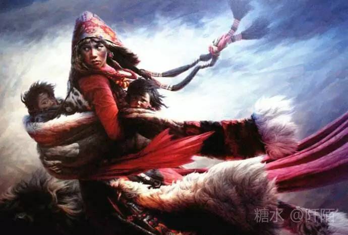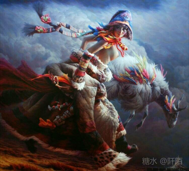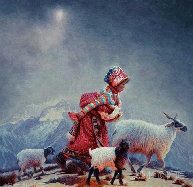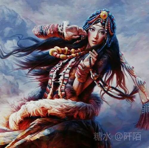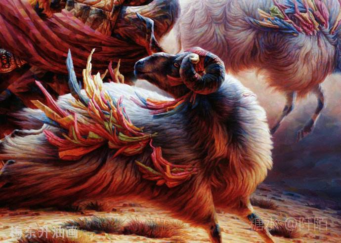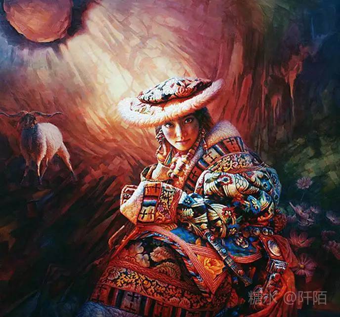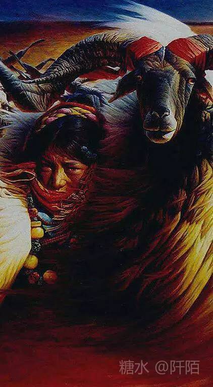 此前也读过艾轩、陈丹青等大师们画的西藏人物画,梅东升笔下的藏人油画与前者的静态相比,一. 他画中的人物大多盛装出场,色彩明快了许多,多用蓝、红,甚至朱红,增强了视觉冲击力; 二. 整个画面中的各个元素都在飘,在飞扬,你看高原的风吹起了一切,是一种裹携着绚烂色彩的跳动,画中充满动感,充满张力。这是作者的艺术夸张,却在情理之中,不感突兀。梅画传递给我们的信息,是一个生机勃勃的西藏。