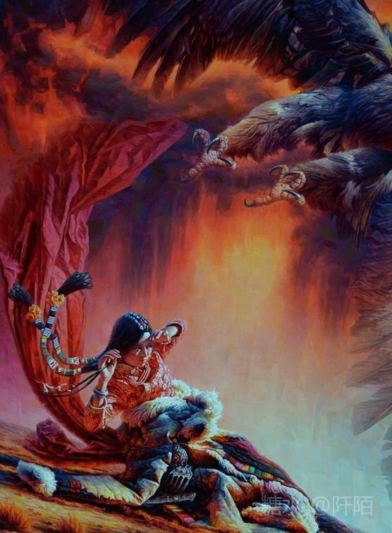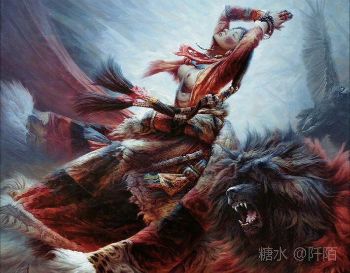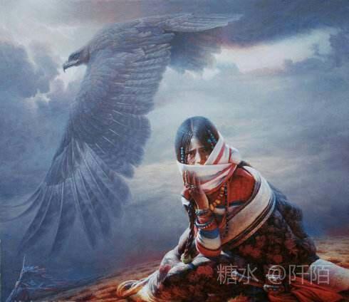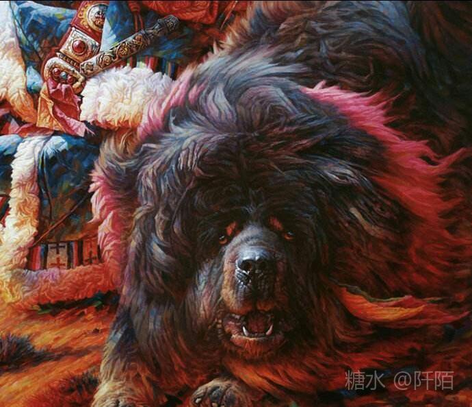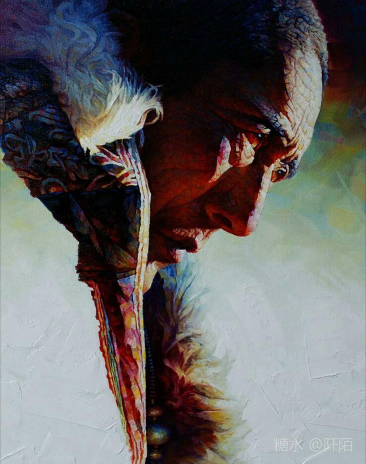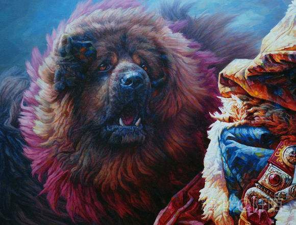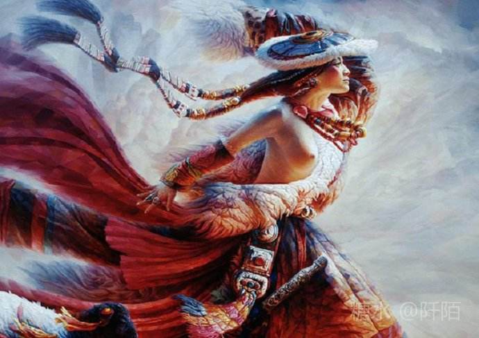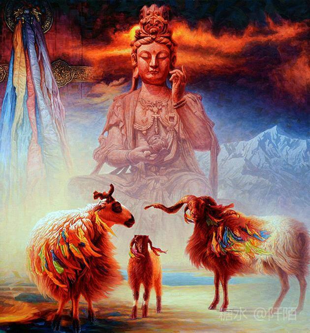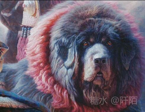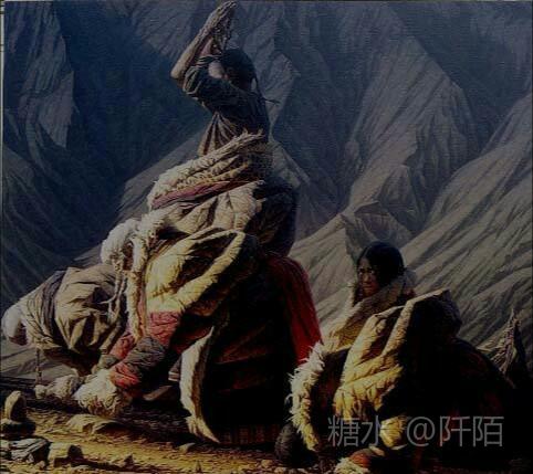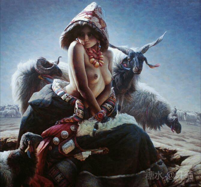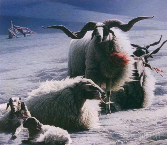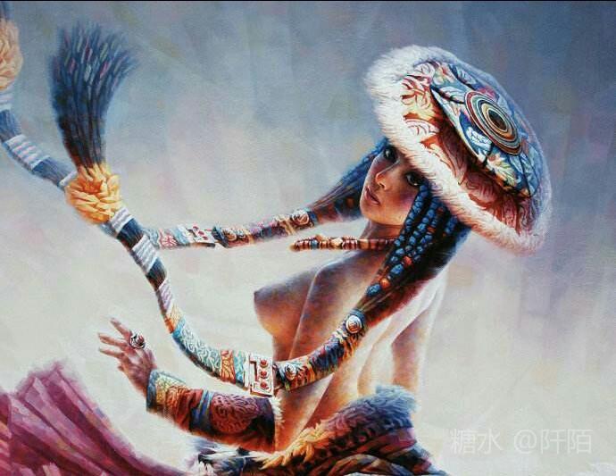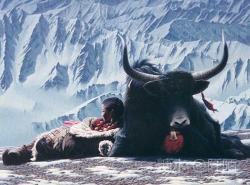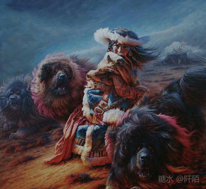 此前也读过艾轩、陈丹青等大师们画的西藏人物画,梅东升笔下的藏人油画与前者的静态相比,一. 他画中的人物大多盛装出场,色彩明快了许多,多用蓝、红,甚至朱红,增强了视觉冲击力; 二. 整个画面中的各个元素都在飘,在飞扬,你看高原的风吹起了一切,是一种裹携着绚烂色彩的跳动,画中充满动感,充满张力。这是作者的艺术夸张,却在情理之中,不感突兀。梅画传递给我们的信息,是一个生机勃勃的西藏。