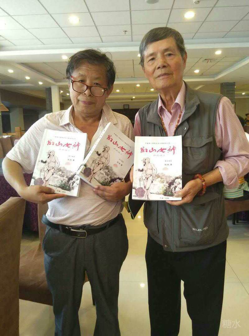 2014年金秋节阅读著残疾人作家张杰先生的《红山女神》小说后应张杰的请求洪博士为小说撰写了序言题写了书名并担任本书的史学顾问组织24人台湾的红山文化专家学者艺术家专程穿越台湾海峽耒到了女神故里辽宁朝阳受到朝阳市委政府的热情接待期间同作家张杰著名红山文化专家陶松林红山草猪承救者