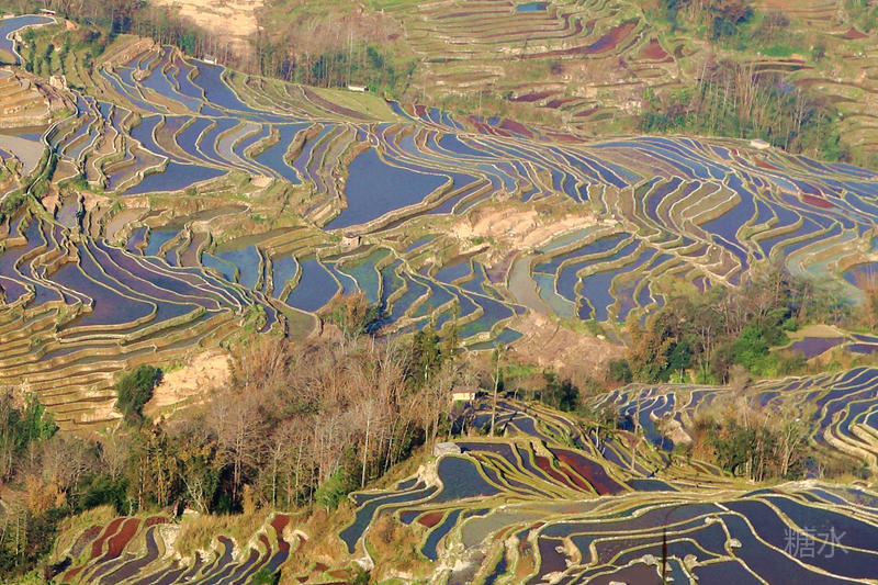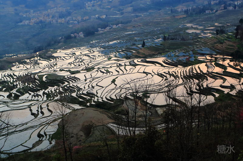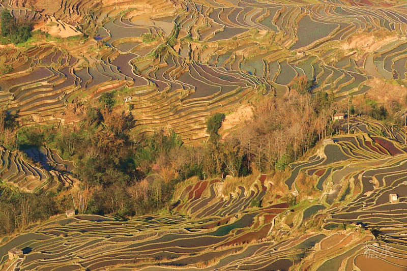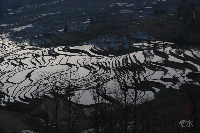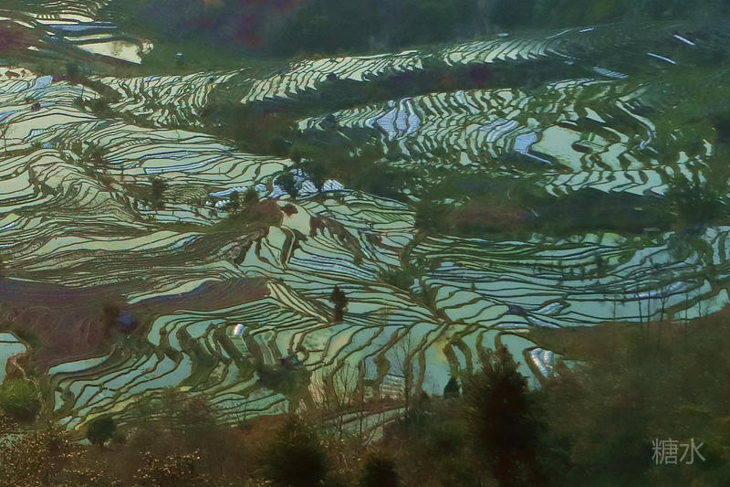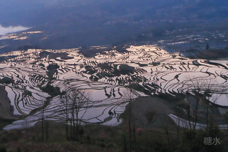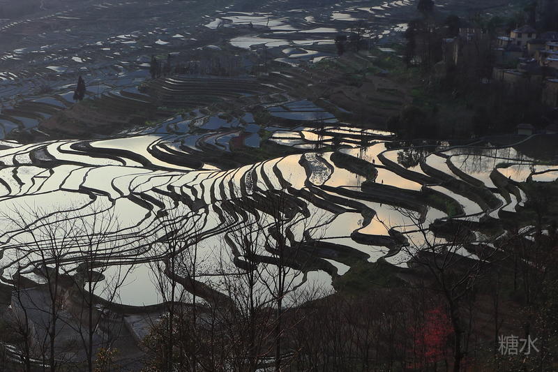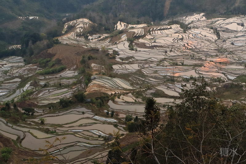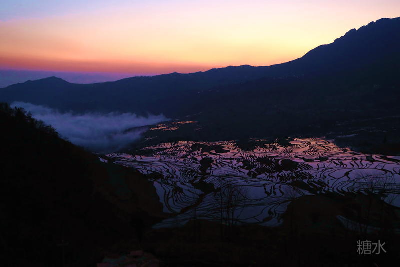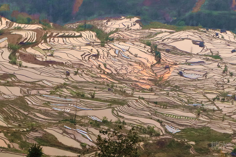 随着太阳渐渐落下,天空越来越红,梯田也在落霞的照射下,映衬出多种颜色。