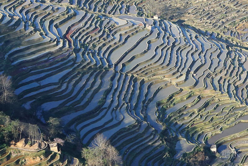 早春二月,云南省红河哈尼族彝族自治州元阳县近20万亩梯田已灌水泡田进入备耕期。放眼望去,山岭沟壑间千层水网,万叠田畴,或波光粼粼,或波平如镜,景色奇幻。