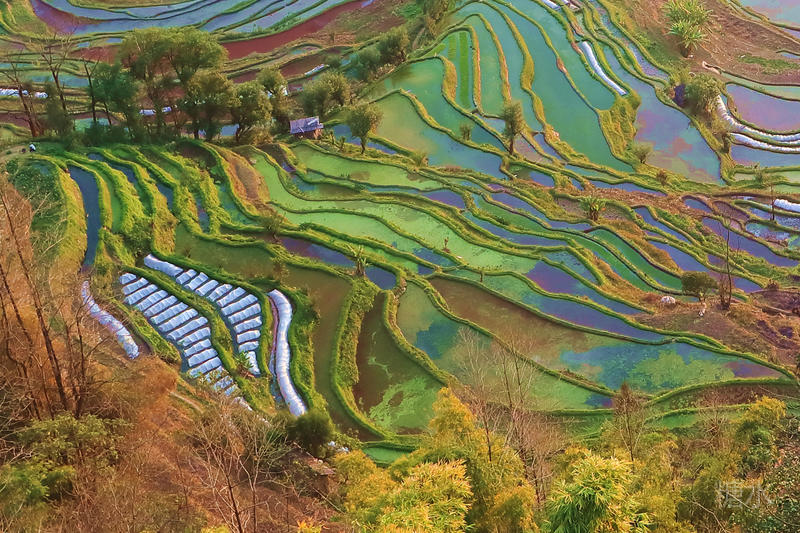 远处山谷水汽凝成的白云正慢慢向梯田爬升。梯田在晨光映衬下,或蓝或红或白改变着色彩。