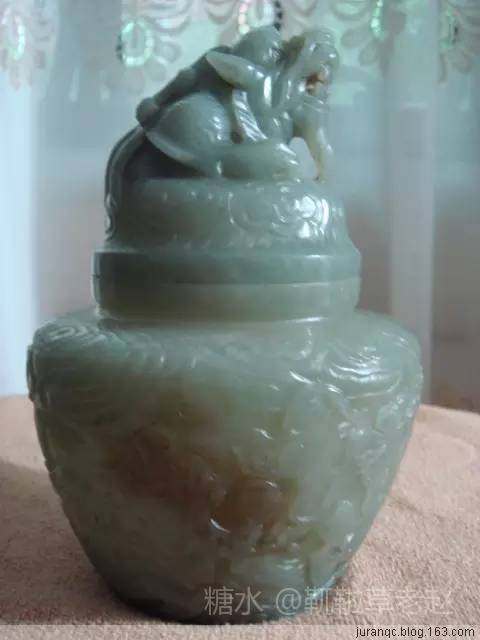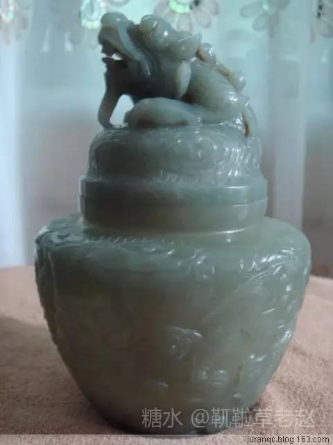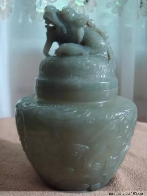 龙,是中华民族最重要的图腾,它蕴含着吉祥嘉瑞、奋发向上的精神,龙是中华民族的象征,中国人也一直自誉为是“龙的传人”。对每一个炎黄子孙来说,龙的形象是一种内涵丰富的文化符号、一种血肉相联的情感。 最早的玉雕龙纹,出现在新石器时期的红山文化,并从未间断地一直延续到清代,乃至今天。经过几千年沧海桑田的变化,每个时代的龙都有每个时代不同的形态和各个时代独有的表现特征。 此云龙纹玉盖罐,系采用整块和田籽玉雕刻而成,玉色偏青,质地坚致细密。玉工采用了浮雕的方式,罐的通体雕刻有云龙纹。由图可见,此罐雕工细腻,纹饰写实,通体连绵不断,活龙活现地展示了龙在云海中翻腾的景象。尤其罐子的盖部,一条巨龙破云而出,不可一世,盛气凌云,不仅凸显了玉工的高超技艺,而且还展示了古代玉雕艺术的魅力。