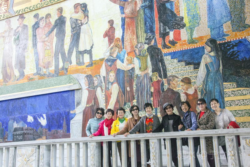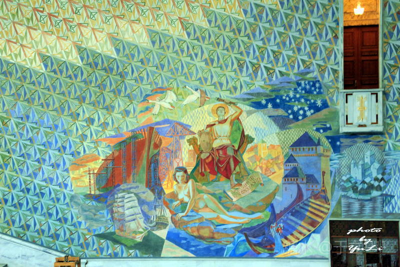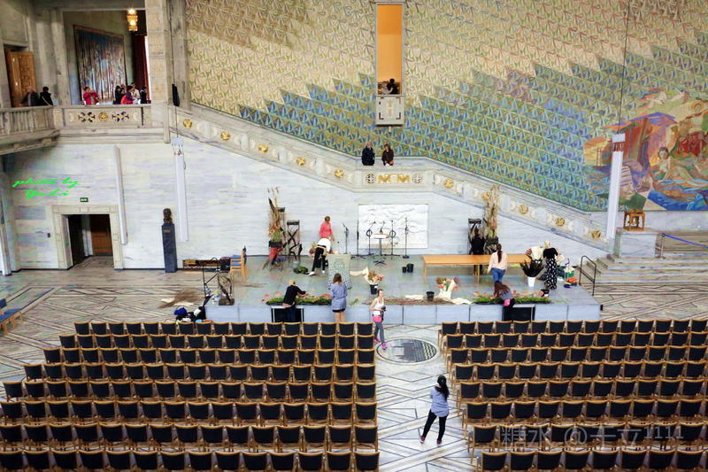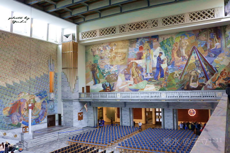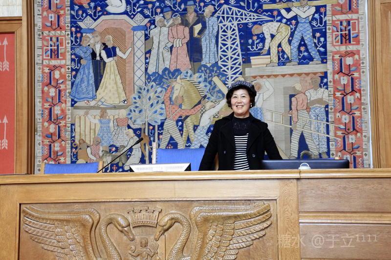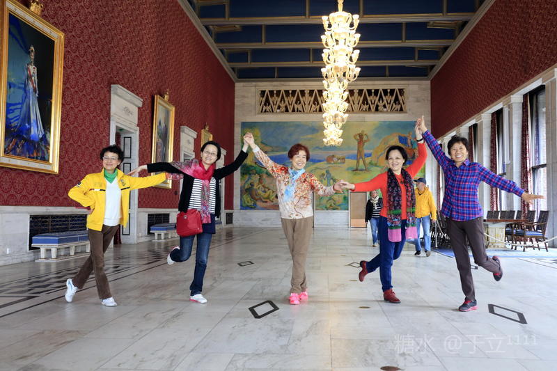 市政大厅宽阔、敞亮的会场,近30米的高挑空间,以及四周墙上色彩绚烂的壁画,构建了庄严、宏大的气场,又洋溢着多彩、温馨的气息。 中国大叔大妈们在这个山妖的自由天地里,竟然可以无拘无束地自由嬉闹。不禁想起了国内那些森严的政府机关大楼,仿佛换了人间。