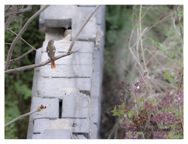 突然一只北红尾鸲飞到残墙边的树枝上,这里的生态环境可见尚好。