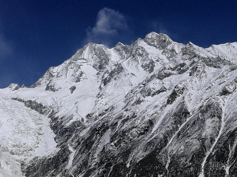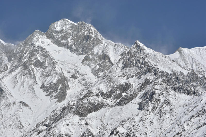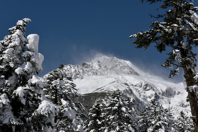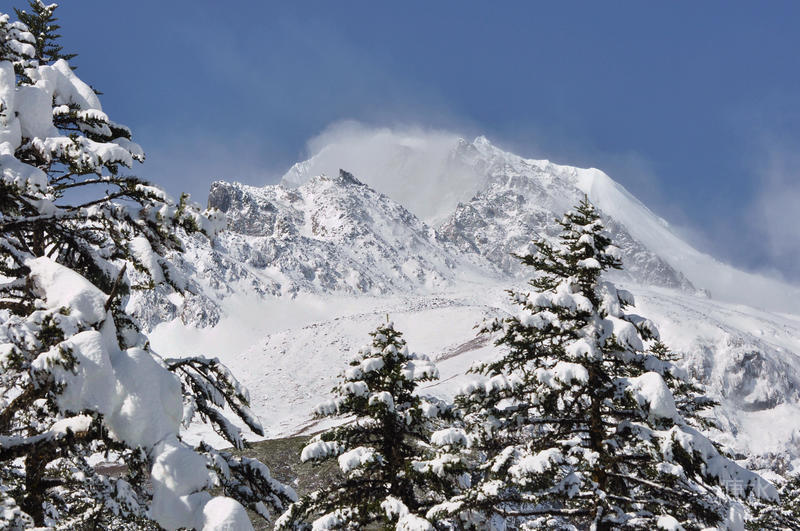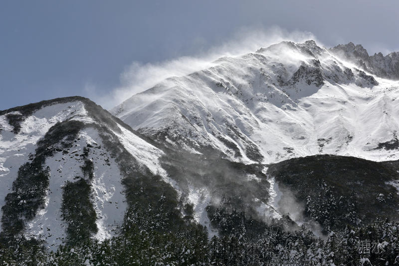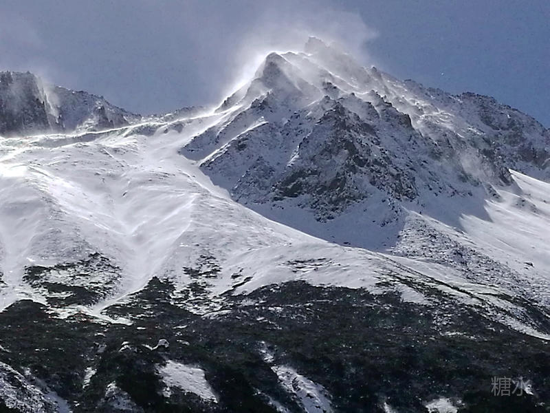 长焦远摄雪峰,可见高山风起、雪粉飞旋。