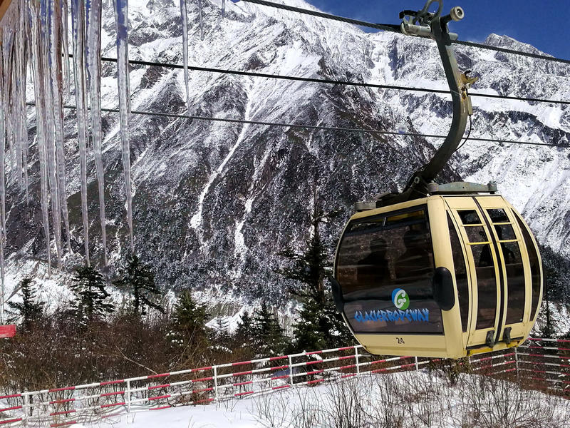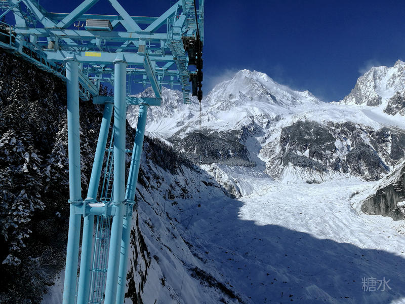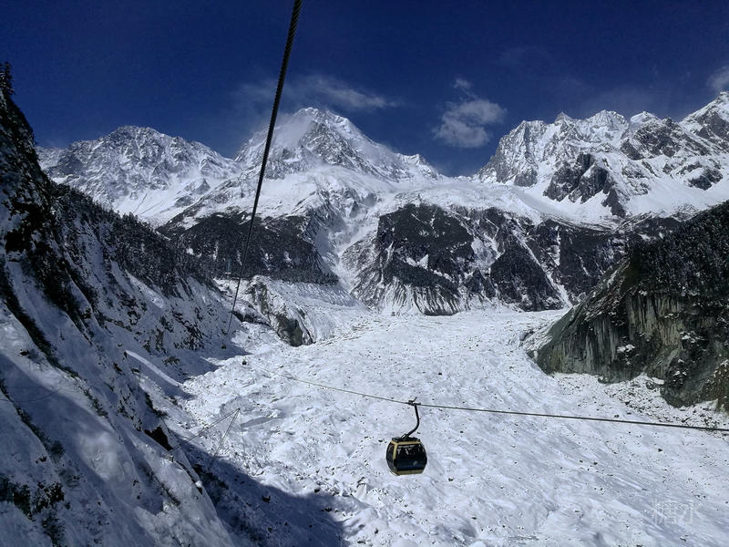 乘坐景区交通车,经过近一小时的攀爬,终于到达三号营地。在这里可以选择乘坐缆车继续上行至四号营地,欣赏雪山冰川的宏大场景,也可沿森林中的栈道前行,深入冰川前沿与冰舌亲密接触。我选择乘缆车继续登顶。