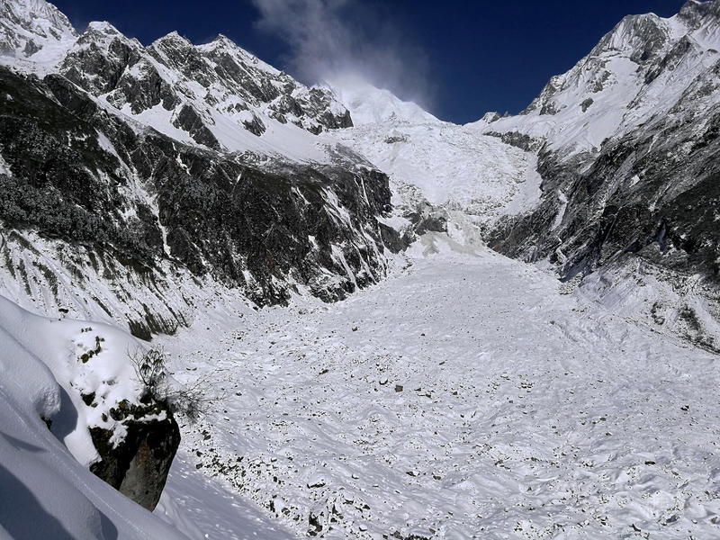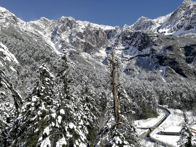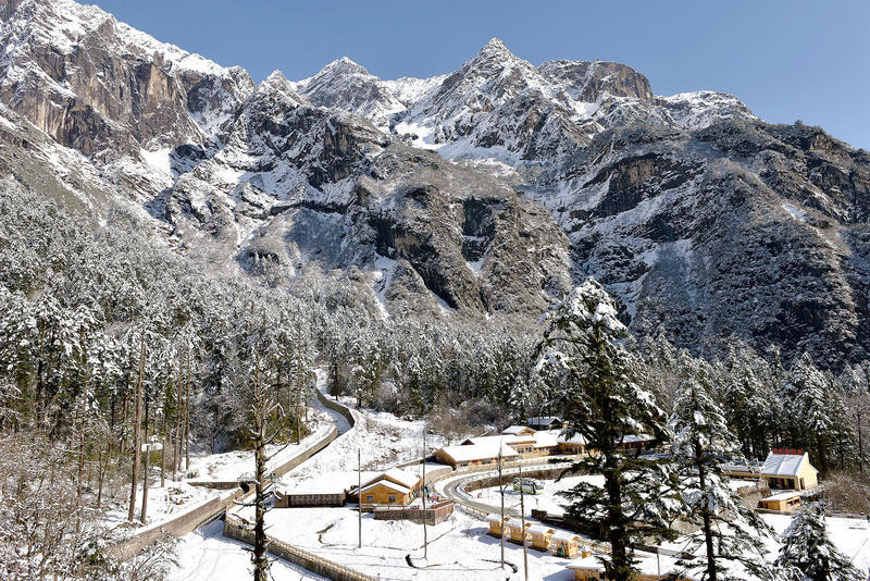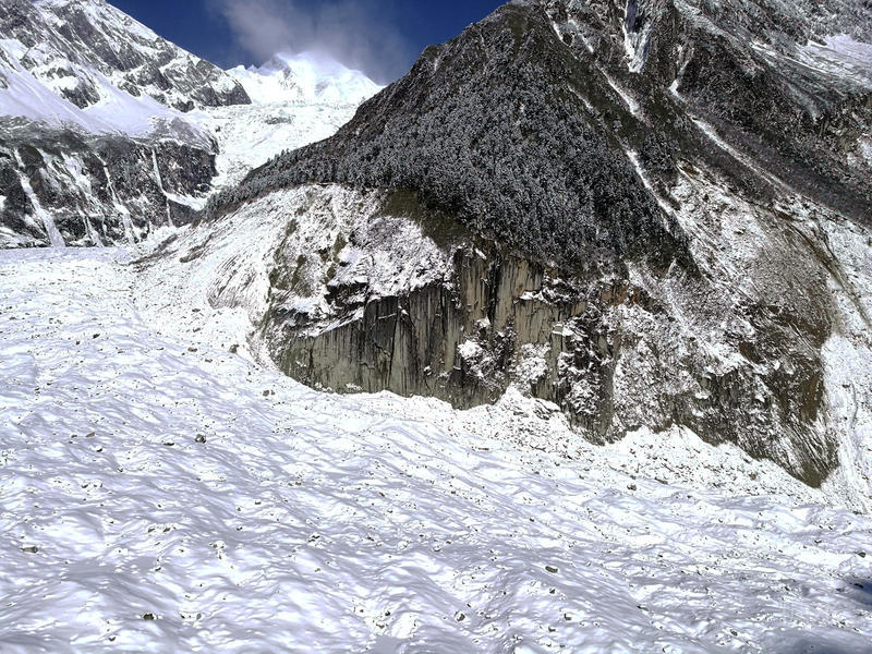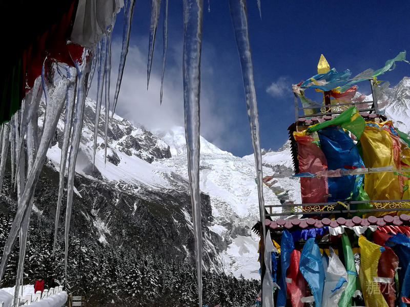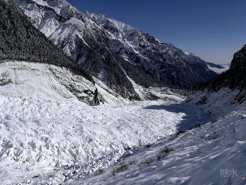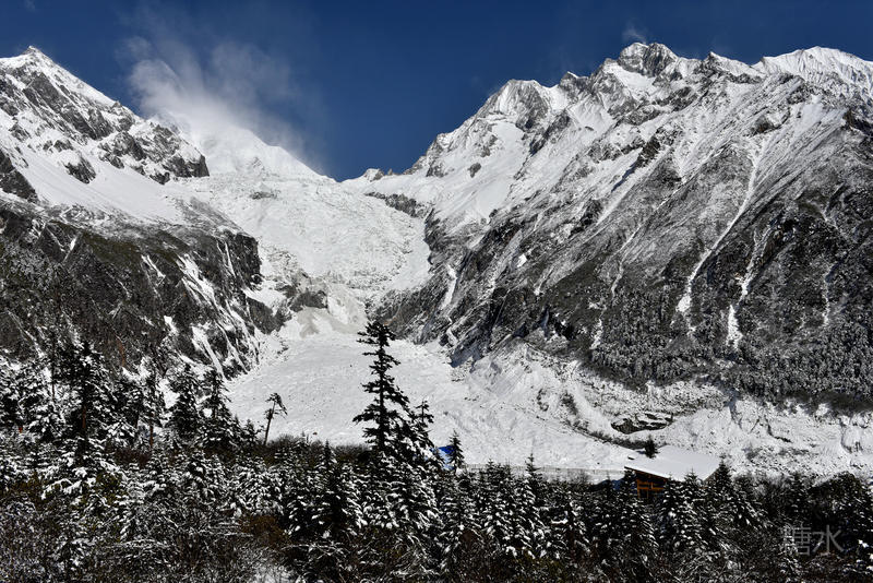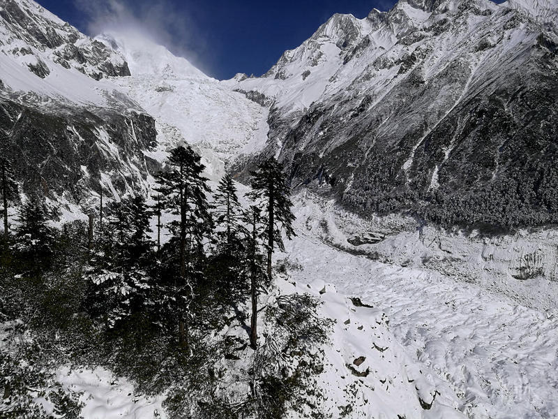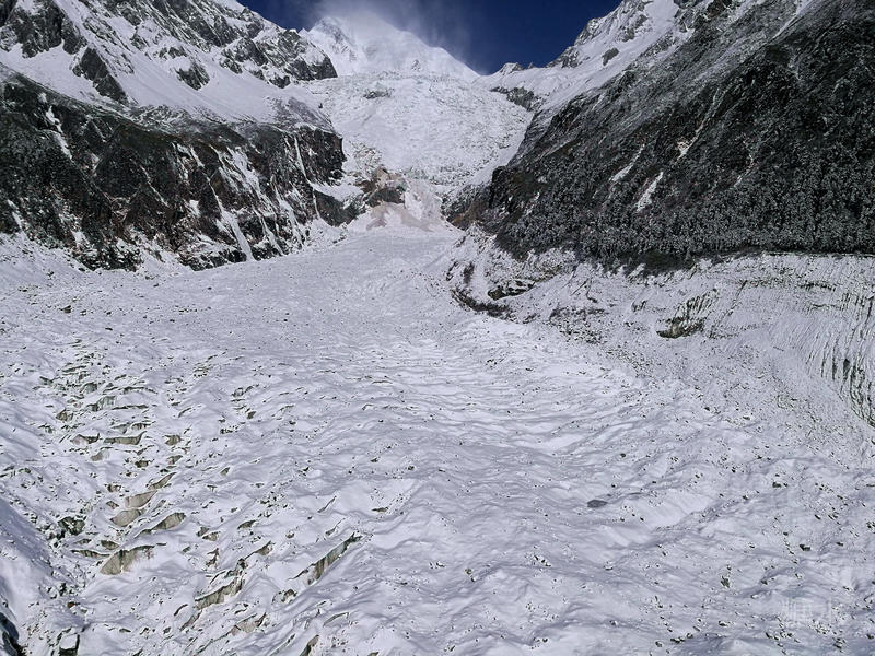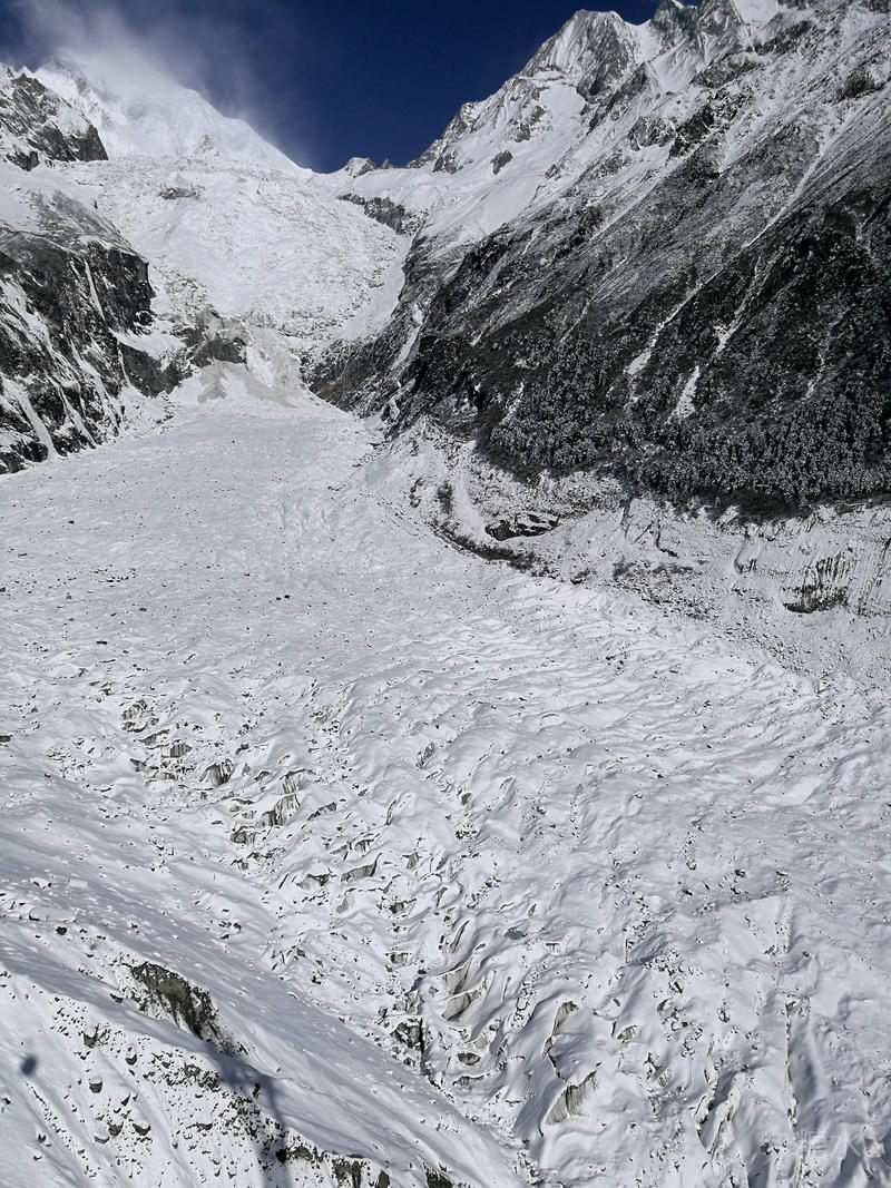 海螺沟内白雪皑皑,冰川如江流奔泻。