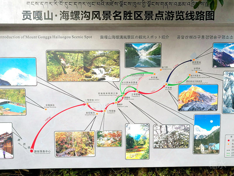 翌日进入海螺沟冰川森林公园,2个月前这里刚刚新晋为国家5A级旅游景区。海螺沟冰川发源于贡嘎山主峰东坡一条冰融河谷,最低点为海拔2850米,冰川舌伸入原始森林6公里。海螺沟内有一举世无双的宽1000多米、直落1080米的大冰瀑布。在沟内还有数十处温泉,游人可在冰川上泡温泉。