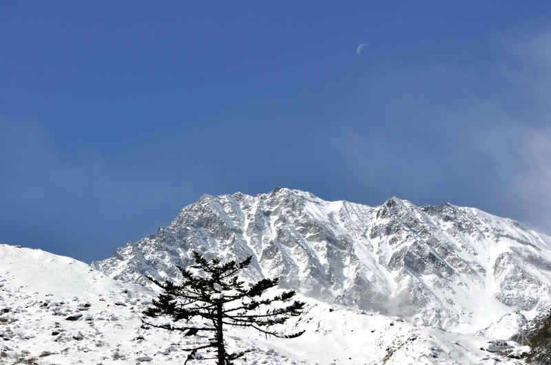 雪山之上可见残月一轮。