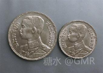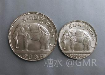 1929年发行的面值50萨当和25萨当的银币,正面为拉玛七世侧面像,背面为跨步行走的大象