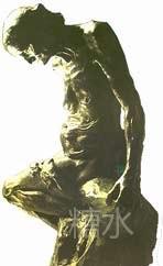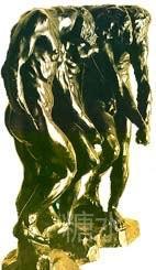 青铜,罗丹创作于1880-1881年。 《三个影子》是地狱之门顶端的一组群雕,这三个人像实际上是一个人,身姿和动态完全一样,每一个都似乎是另一个的影子,胸腰扭曲着,站立在一起。三人的头部接触于中心,每人的左手也都垂伸下来,互相触碰在一起,好似在寻找什么,或者是雕刻家有意识地通过这种手势,引导着观众注视三个人脚下所发生的地狱情节。他们表现出一种充满痛苦的挣扎,走近地狱的边缘。组雕左边一个是亚当,其他两个自然就是亚当的影子,但谁又能说得清到底哪一个是亚当,谁又是谁的影子呢?他的姿态倾斜,好似摇摇欲坠。他曾遭上帝的惩罚,因为他同妻子夏娃偷吃了上帝唯一禁止人吃的“知善恶之果”,被逐出乐园,并使这种人类的痛苦世代相传--人类犯下的第一个罪行,正是因为追求智慧和光明的到来!亚当,这是人类的父亲,是一个健美雄壮的男人,为自己的孩子辛勤的劳动。而一代又一代的父亲们,这些在构造上重复着亚当的影子们,在精神上也仍然是他的影子。他们在肉体上如此强有力,却永远不能主宰自己的命运。在分离的罪孽和苦难面前,他们低垂着头,他们大幅度歪扭的身躯和向一边使劲歪倒的头,显示了精神和肉体的重压是如此艰巨。但宽厚的肩胸和健美的肌体,却显示着内在的生命与力量。他们那沉冥的表情带着忏悔后的宁静和甘愿自食其果、忍辱负重的勇气,仿佛坚信自己肉体的力量,足可以承受无尽的磨难。 罗丹在作品中表达了对人类命运的关切,但他却得出一个悲剧性的结论:一种不可克服的欲望,对智慧和光明的追求,而且是第一次追求,却给人类带来了永恒的劫难,使之不得不落入痛苦的深渊。罗丹在表现手法上,以掌握“艺术中的运动”来传达人文的内在情感。亚当的形象虽被称为“影子”,但他具有活人的生命,而这生命正是罗丹所赋予的。