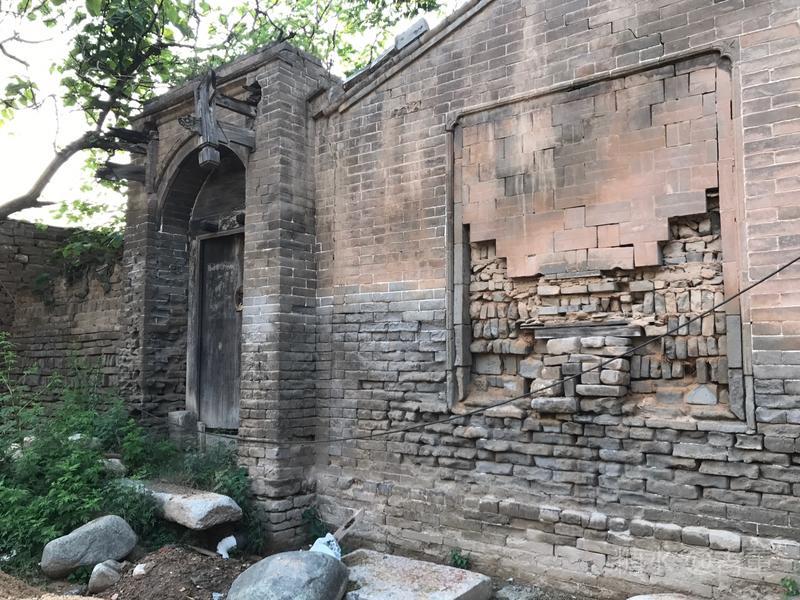 走出老大姐家,向巷子深处走去。 遗留下的老房子有半弧形门洞,颓败砖堆长着茂草,疑为古代门洞坍塌;询问果然。 水坡巷夹在印台山和麒麟山之间的一段斜坡上,能望见山顶古烽火台、山麓上逶迤而下的裸露残破古长城,长城上的明代古砖均被当地居民拆下做院墙猪圈了(我们在老大姐家也见到了一些城墙用砖,随后在走到其他家时,房主人讲给我:原来城墙砖8毛钱一块,送到家里;现在15块一块还买不到)。