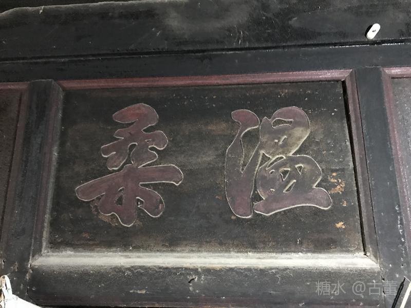 房门上端两侧窗框上端镶嵌着熏的发黑的木刻字迹清晰流畅。