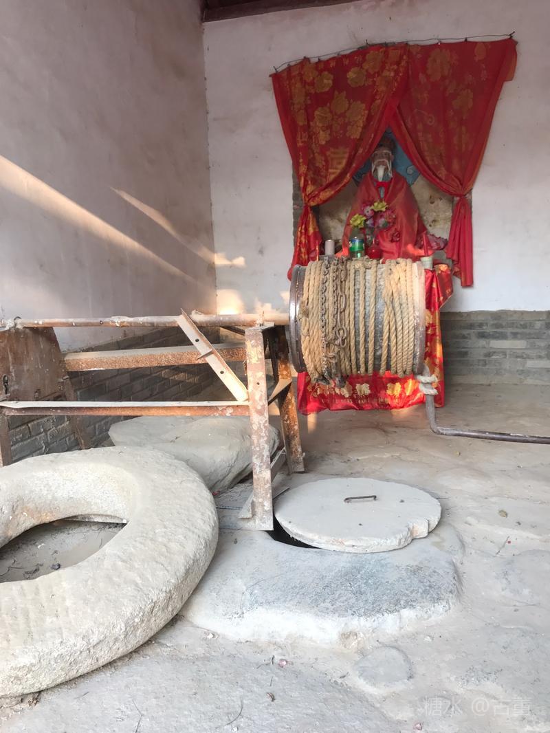 村中间一口古井,据说掘于唐,乾隆帝喝过,为了保护为它盖井亭,原来古老的辘轳还在一户老乡家存着,现在的辘轳已经是新制作的了。
