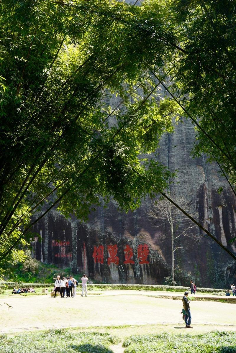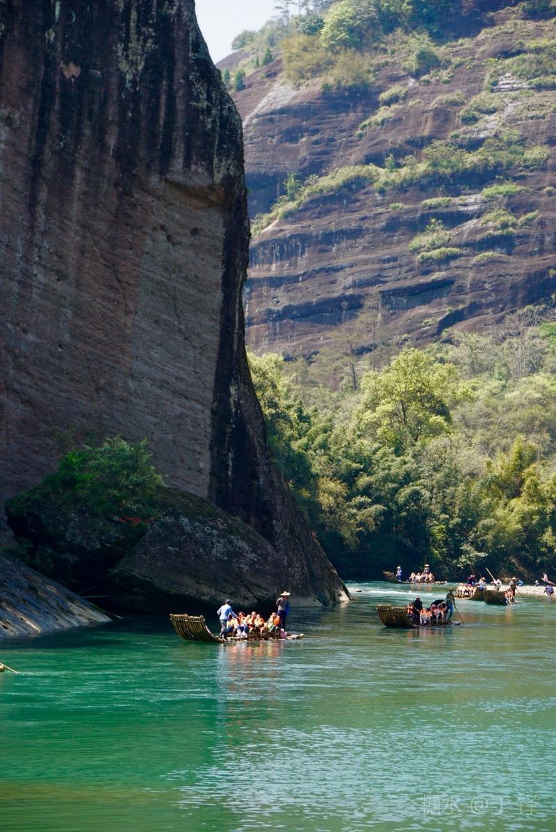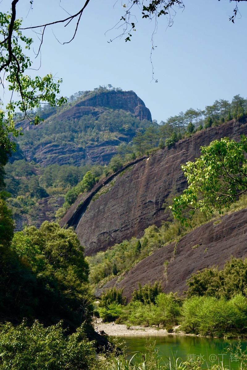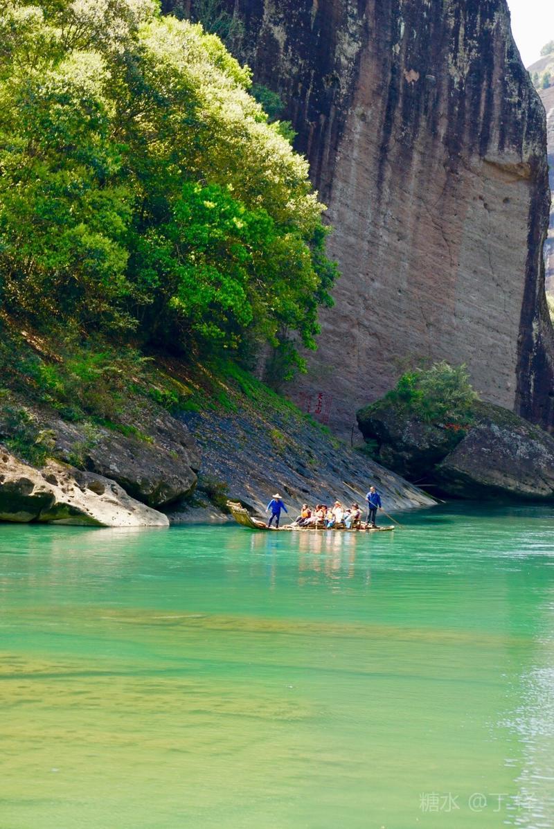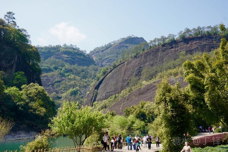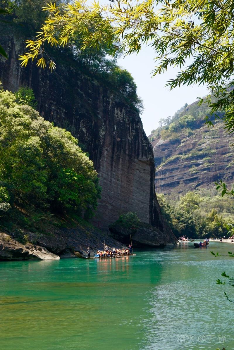 天游峰的景色确实优美,除了攀峰可一览武夷山的秀丽山水外,山下的景观也很有特色。一是可欣赏崖壁上的历代书法;二是可近距离的体验“壁立万仞”豪气冲天的气势;三是在九曲溪边,看竹筏漂流,款款而来的神韵。