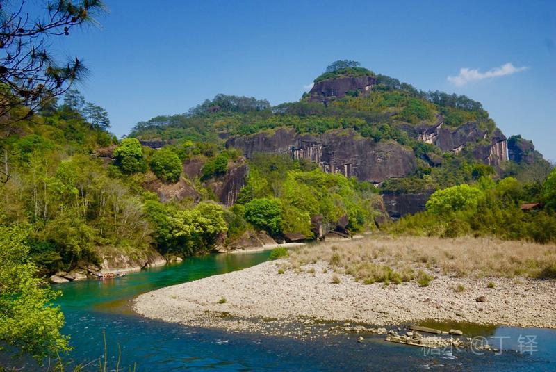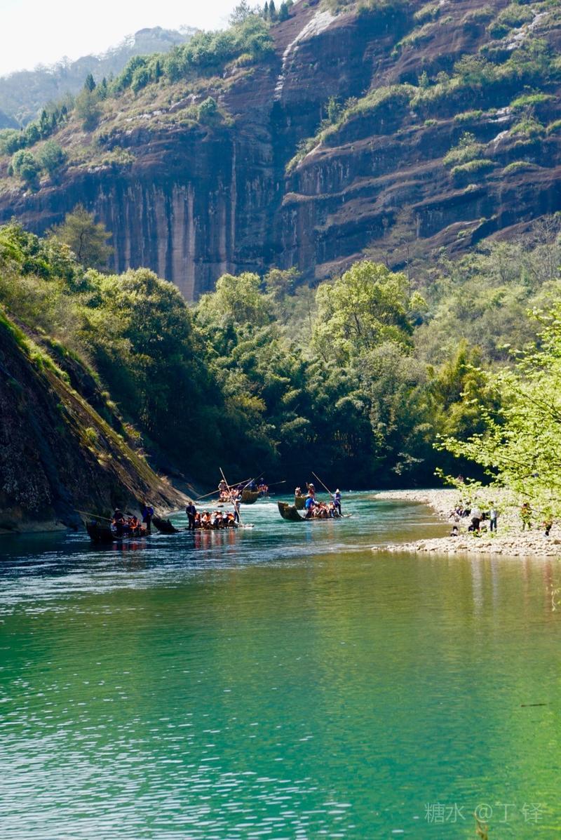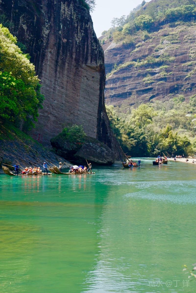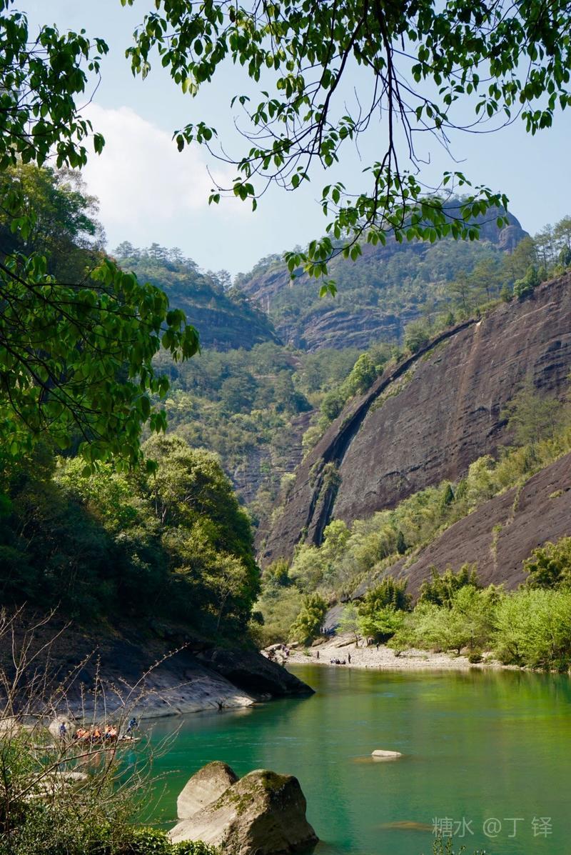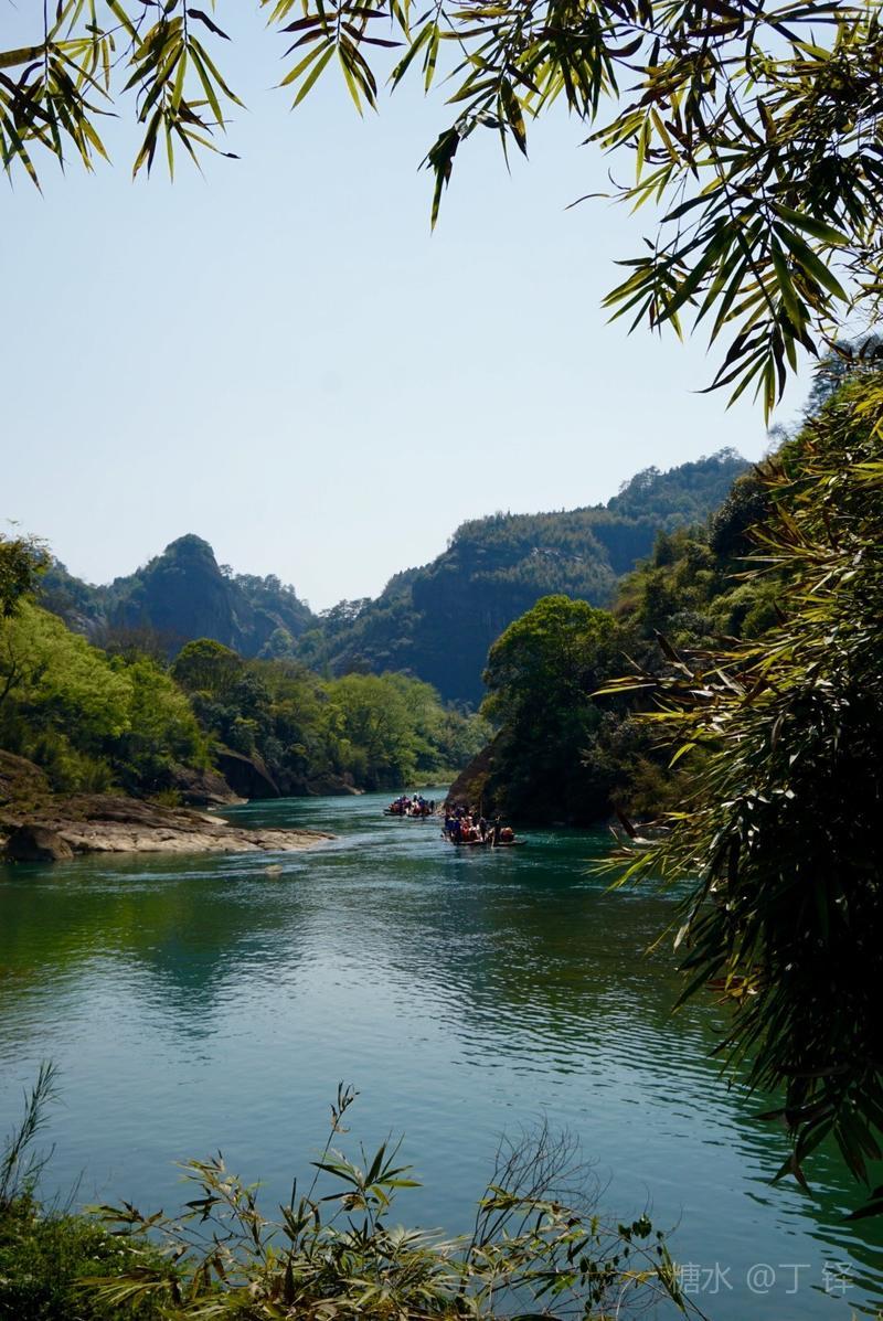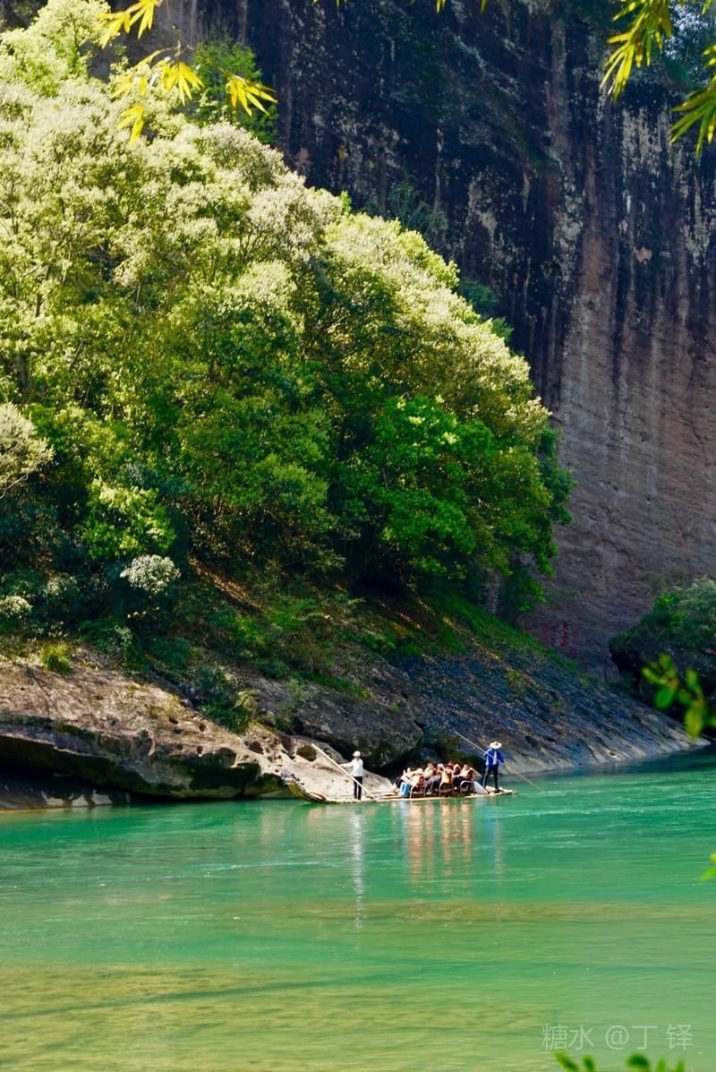 天游峰的景色确实优美,除了攀峰可一览武夷山的秀丽山水外,山下的景观也很有特色。一是可欣赏崖壁上的历代书法;二是可近距离的体验“壁立万仞”豪气冲天的气势;三是在九曲溪边,看竹筏漂流,款款而来的神韵。