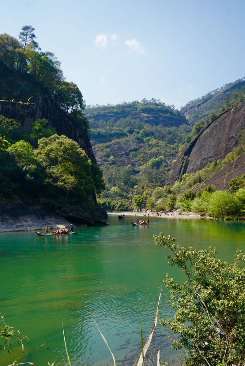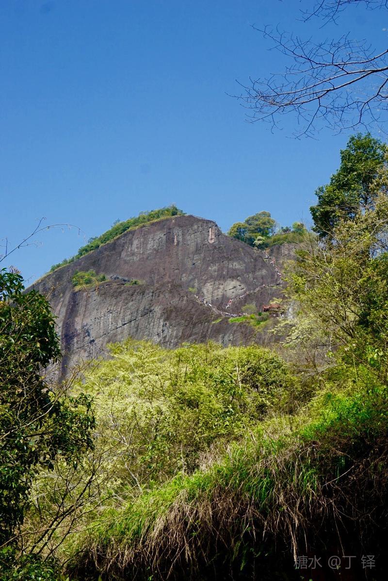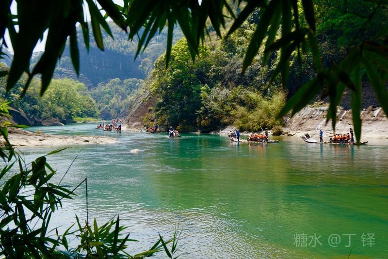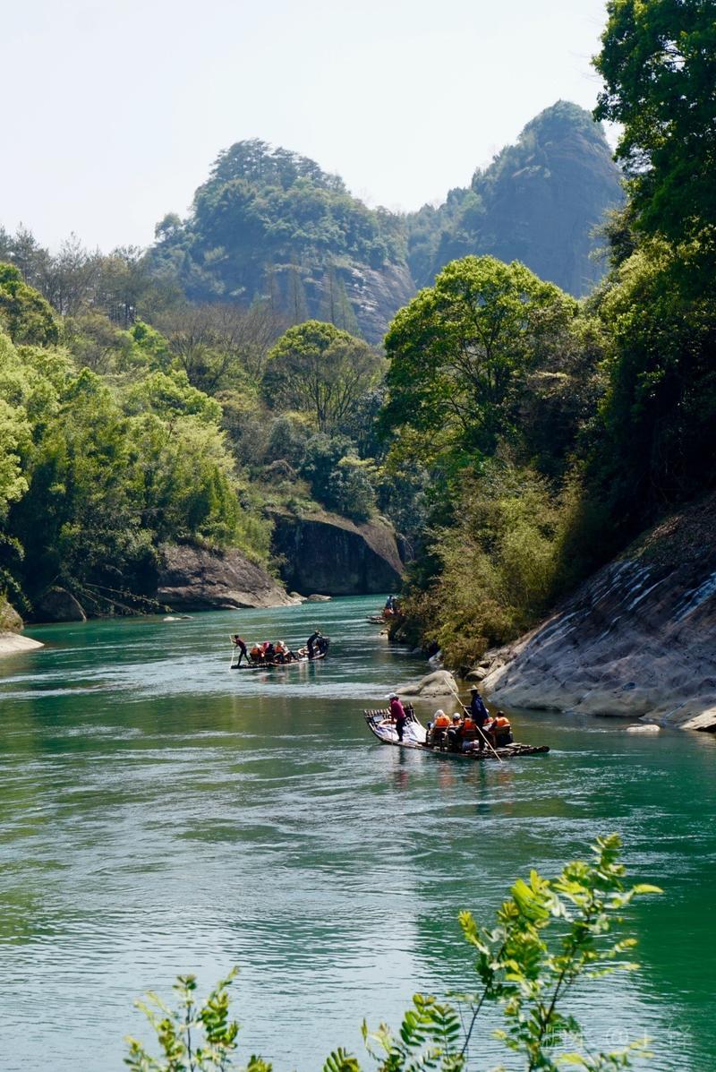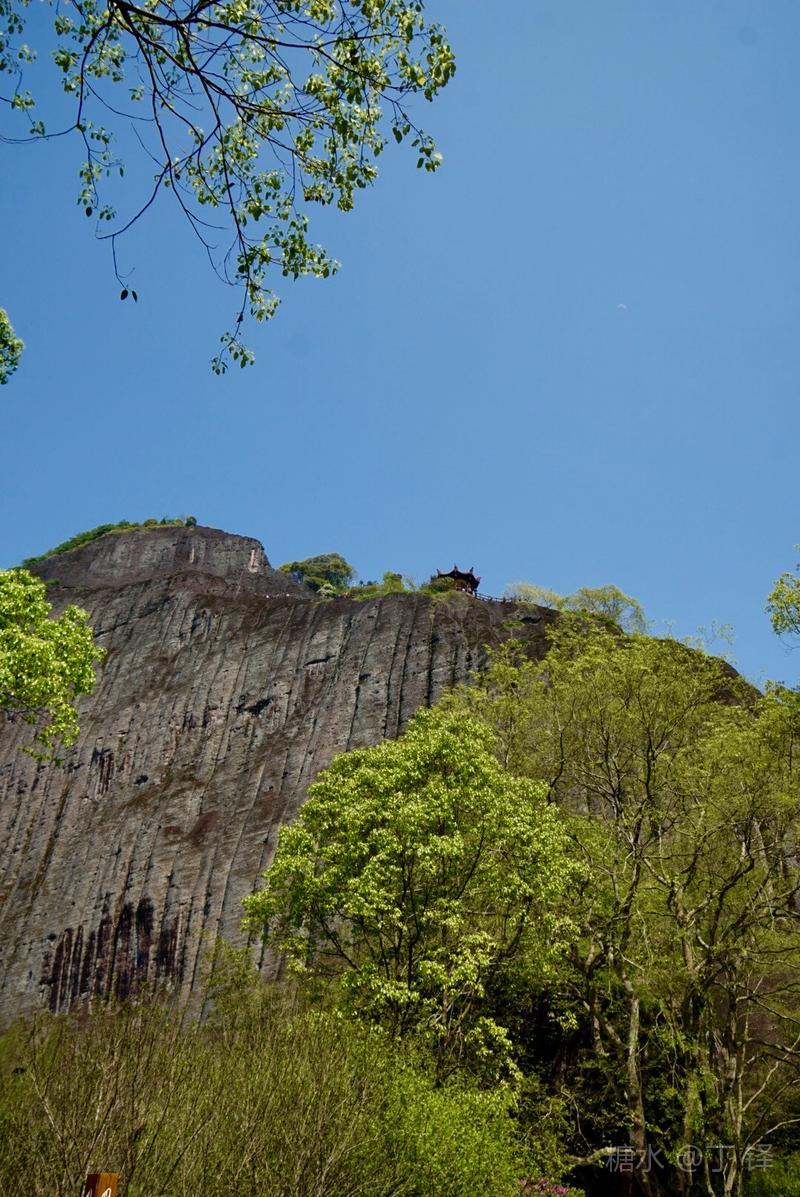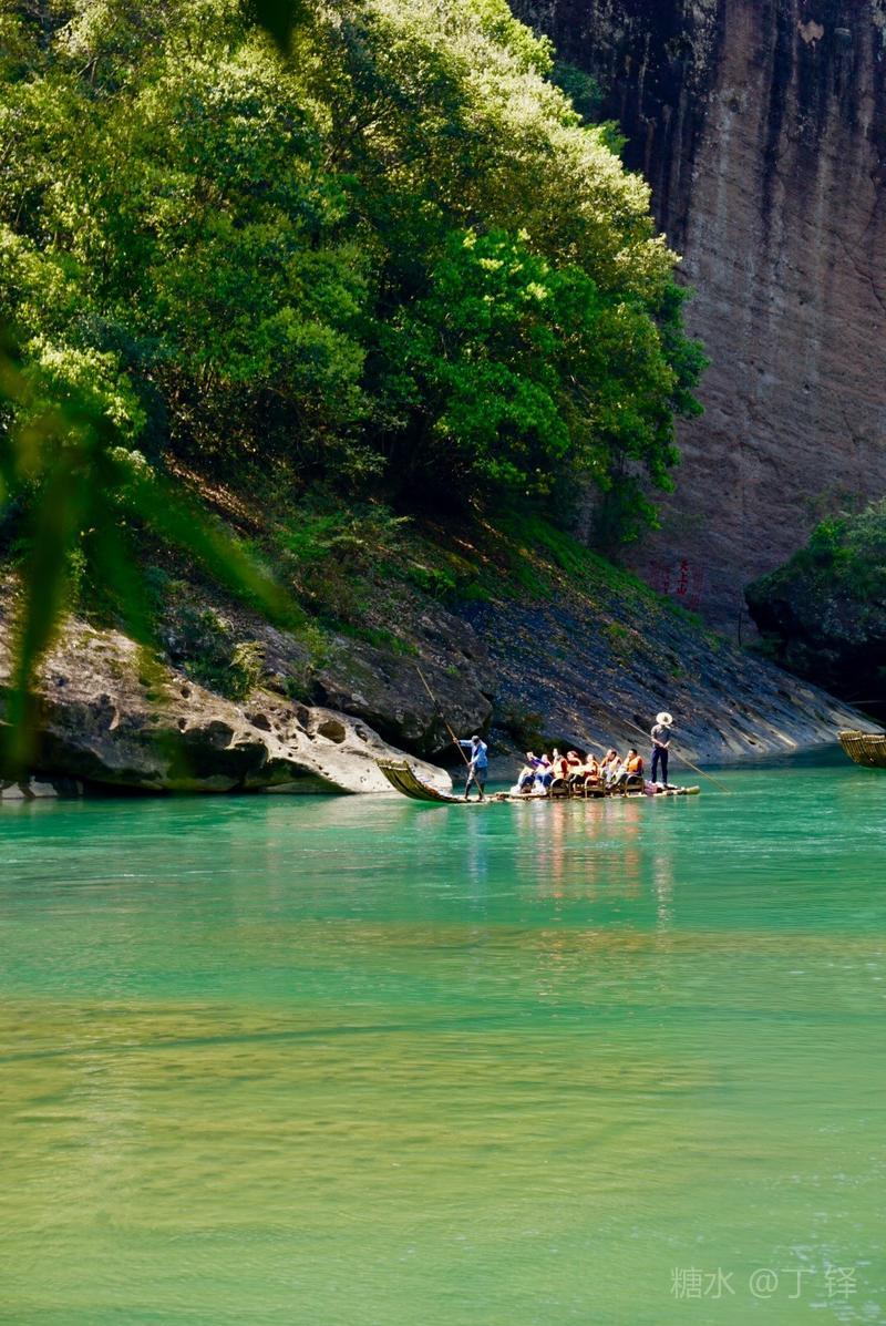 天游峰的景色确实优美,除了攀峰可一览武夷山的秀丽山水外,山下的景观也很有特色。一是可欣赏崖壁上的历代书法;二是可近距离的体验“壁立万仞”豪气冲天的气势;三是在九曲溪边,看竹筏漂流,款款而来的神韵。