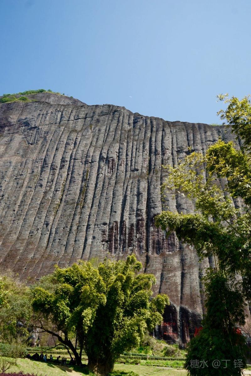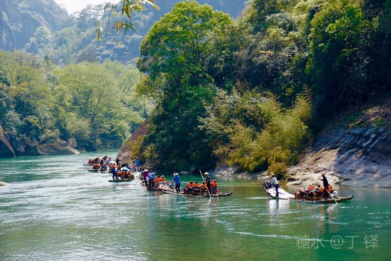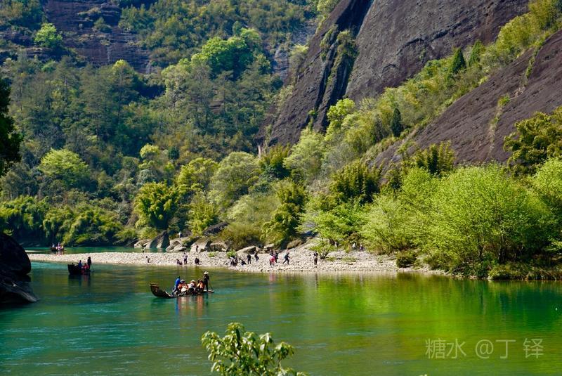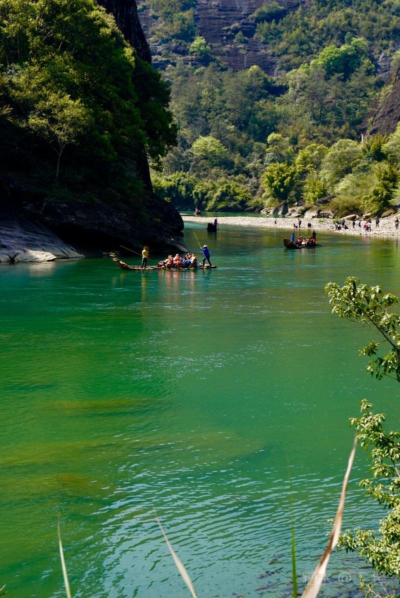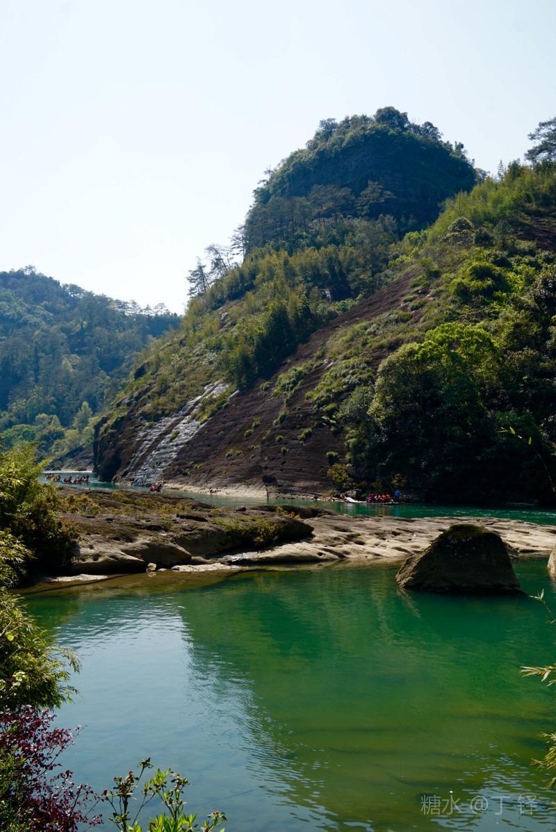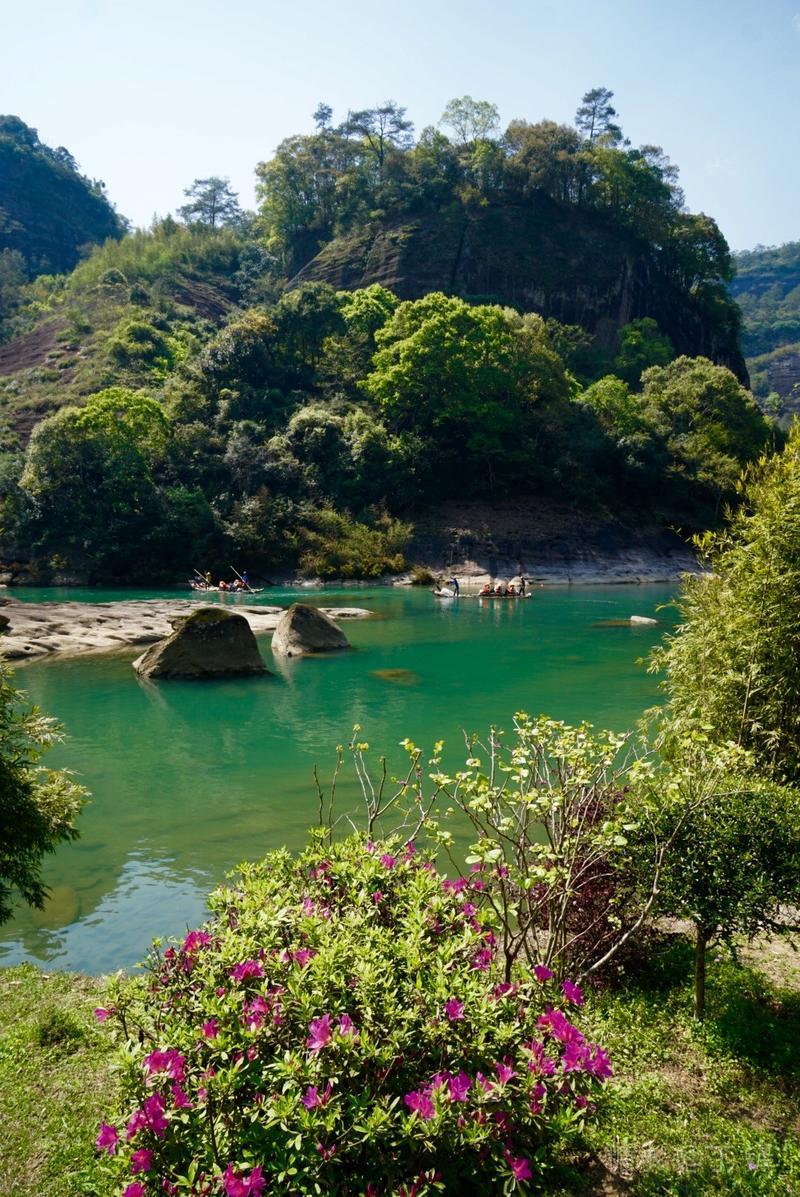 天游峰的景色确实优美,除了攀峰可一览武夷山的秀丽山水外,山下的景观也很有特色。一是可欣赏崖壁上的历代书法;二是可近距离的体验“壁立万仞”豪气冲天的气势;三是在九曲溪边,看竹筏漂流,款款而来的神韵。