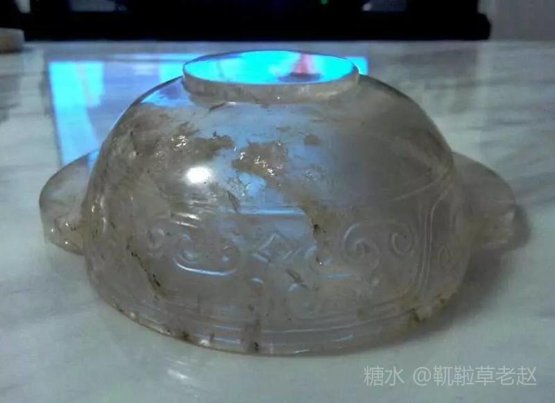 羽觞(shang),又称羽杯或耳杯,是中国古代的一种饮酒的容器。羽觞外形椭圆、浅腹、平底,口沿两侧各有一半月形耳,且耳如鸟之双翼,故被叫做“羽觞”,又因状如人之两耳,故亦叫“耳杯”。 据考证,羽觞这种器形最早出现在战国的青铜器上,并发现其上铸有一个铭文,该铭文为金字旁加个“和”字,发音“舟”,舟乃小船的意思。由图可见,羽觞的外形恰如一艘小船。到了汉代这类饮酒的“舟”才被定名为羽觞,一直延续到魏晋南北朝,到唐代的时候绝迹。 《楚辞·招魂》曰“瑶浆蜜勺,实羽觞些。”洪兴祖补注:“杯上缀羽,以速饮也。”《汉书·外戚传·孝成班婕妤》:“顾左右兮和颜,酌羽觞兮销忧。”颜师古注引孟康曰:“羽觞,爵也,作生爵形,有头尾羽翼。”南朝梁元帝《采莲赋》:“鷁首徐廻,兼传羽杯。”唐李白《春夜宴从弟桃花园序》:“开琼筵以坐花,飞羽觞而醉月”。总之,对羽觞的记述可谓由来已久,不胜枚举。 另外,在西汉马王堆汉墓出土的漆羽觞底部有“君幸酒”、“君幸食”的铭文。还有,在徐州黑头山汉墓出土的铜炉上面有一个用来蘸酱料的羽觞杯。因此,羽觞在古代时主要做酒器之用,偶尔也做食器之用。 羽觞大多馆藏所见多为木胎漆器,其它材质的亦有,但较为少见。此白水晶雕制的羽觞杯,器型比例协调,制作精细完整,包浆肥厚。由于历经苍桑,形成了特有的次生“绺裂”和“土沁”,并可见绺裂处有生成美轮美奂的“七彩”反射现象。 提起羽觞杯,不由想起了东晋书圣王羲之在那篇天下第一行书《兰亭序》中的一段话“……引以为流觞曲水,列坐其次。虽无丝竹管弦之盛,一觞一咏,亦足以畅叙幽情。” 元好问《骤雨打新荷》有“人生百年有几,念良辰美景,休放虚过。穷通前定,何用苦张罗?”的暗叹。鄙人虽不好酒,亦想体验一下以恭敬之心双手捧此羽觞,也来个“命友邀宾玩赏,对芳樽,浅酌低歌。”