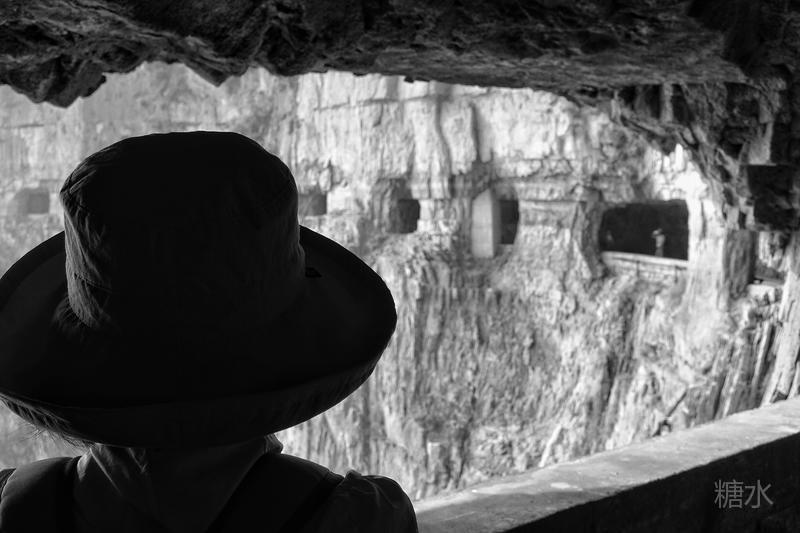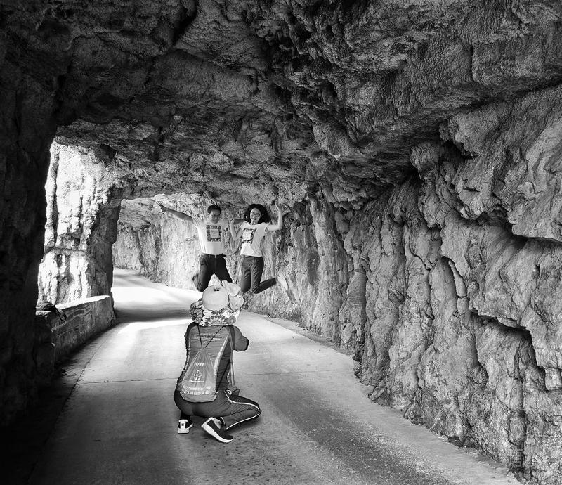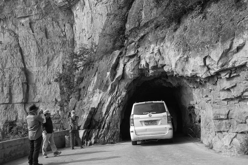 昆山挂壁公路,比郭亮洞更险更窄更古朴味。 导游介绍,1992年,山西省实施“村村通”工程,为解决陵川县古郊乡昆山村民的出行难,决定在王莽岭北面给昆山村民开条南行出路。7个包工队同时作业,在山顶固上缆绳,将工人吊到山腰开洞,分段施工,快速打通了昆山挂壁公路。 新开的挂壁公路未加整饰,路面凸凸凹凹,洞顶垂石嶙峋,侧窗龇牙咧嘴,宽度又有限,最宽的地方3米左右,最窄的地方只有1.95米。