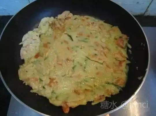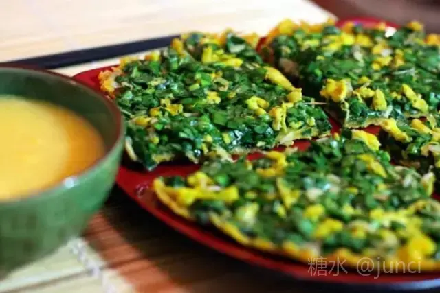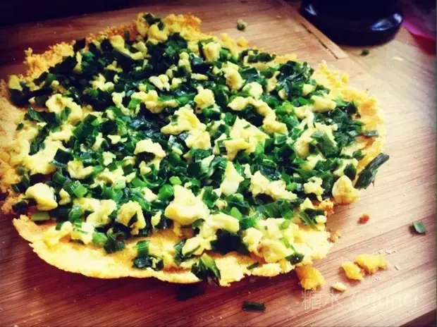 底儿是玉米面做的,鸡蛋、韭菜、虾皮、葱搅拌好了当做馅儿,烙好之后绵软酥脆,醇香可口,那真叫一个好吃!
