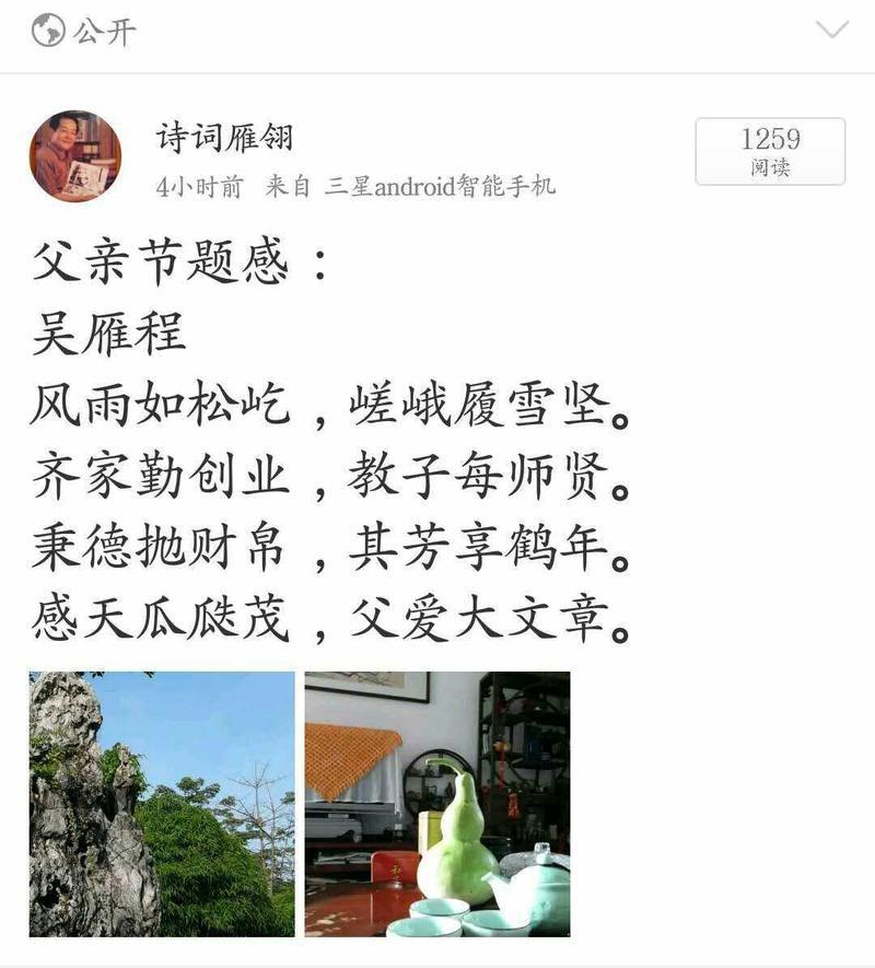 @何光顺(蜀山牧人) 中国社会或许更需要这样一场思想的风暴,在历史的纵深处吹来,涤清积压太久的当代意识形态毒素,以让民族重生吧。 《定风波》之同步韵二人唱歌 · 父亲节之忆 一、王德禄(山东聊城) 回首茫然白发知,缘何总忆少儿时?春夏秋冬霜共雨,知否?父亲劳作未曾归。 脸皱背驼无絮语,蹒步,养家无悔任风欺。老父离吾三十许,心诉,只思欲孝岁移迟。 二、梅锐仁(香港) 父爱严慈冷暖知,身非由己困迷时。韵胁天寒风裹雨,能否?稀星朗月信由归。 下四低三焉敢语?蠕步,风声鹤唳任人欺。残竹孤株撑几许,毋诉,熬过六六逝嫌迟。 2017年6月18日 @和生万物 父亲 一 往昔为儿,已愧严慈无侍奉; 如今作父,尤欣子女有殷勤。 二 当年曾恨铁; 此日已成钢。 【临江仙 相思瘦影】 词 章寿 瑶池琼宴无端醉,相思瘦影横斜。 俗情都道远仙家,阮郎一别,整日梦流霞。 前世有缘仙府住,夜深绝艳清佳。 高唐似梦隔蝉纱,空留环佩,泪眼望天涯。 @夕阳 父 抱丹心日月昭 爱 挑战场斩倭妖 如 歌可泣英雄泪 山 立忠碑上九霄 @彩虹诗梦 父亲节 每怀慈父讲台前,已断音容过卅年。 难把深情归薄纸,只将爱字刻心田。 七绝一首 《仲夏写意》 文/余一 榴花漾夏祝残春, 雨雨风风洗陌尘。 池畔蝉鸣恼人碎, 乌云急急狎雷逡。 父亲节寄怀 吴雁程 人生难得老来狂, 康乐当然第一章。 借酒抹霞留晚照, 夕阳依我海天长。 浪淘沙•忆父亲 阿羊(曾向阳) 夜雨湿流光,闷倚南窗。苍山碧海两茫茫。独坐临屏知是节,乍地悲伤。 无计泪盈眶,无限思量。父常背药走农乡。那日别时无嘱语,泪滴衣裳。 题竹诗两首 卢木荣 2017.6.17 一 风过山头雨更狂, 数竿挺立郁苍苍。 飞珠坠落无声色, 汇入清潭筑玉床。 二 一枝独秀碧云间, 亦雨亦风犹等闲。 未入华堂添丽彩, 两三片叶可曾刪? 七绝/缘 文/风过无痕 舞榭玩文多俗物,轻舟放浪有名贤。 相逢但使千杯尽,且把皇恩换酒钱。