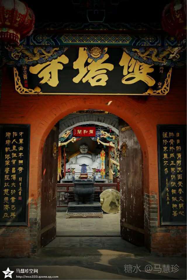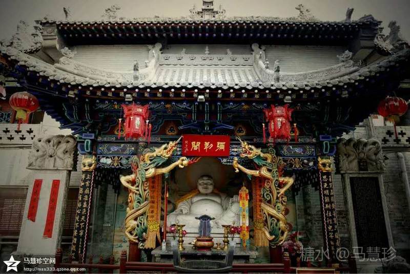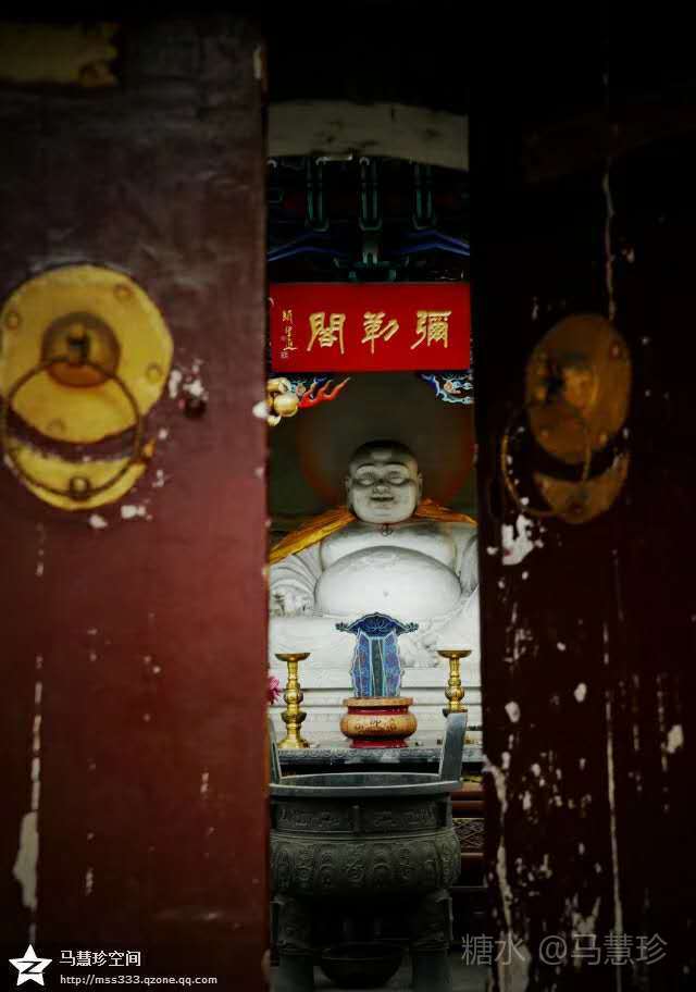 大门里望去是弥勒阁,映入眼帘的是一尊布袋和尚的塑像,他盘腿而坐,向人们投来慈祥的笑容。好像在教导我们:要人心向善,切勿有害人之心;要以理服人,以度化人;要以情动人,以爱感人。