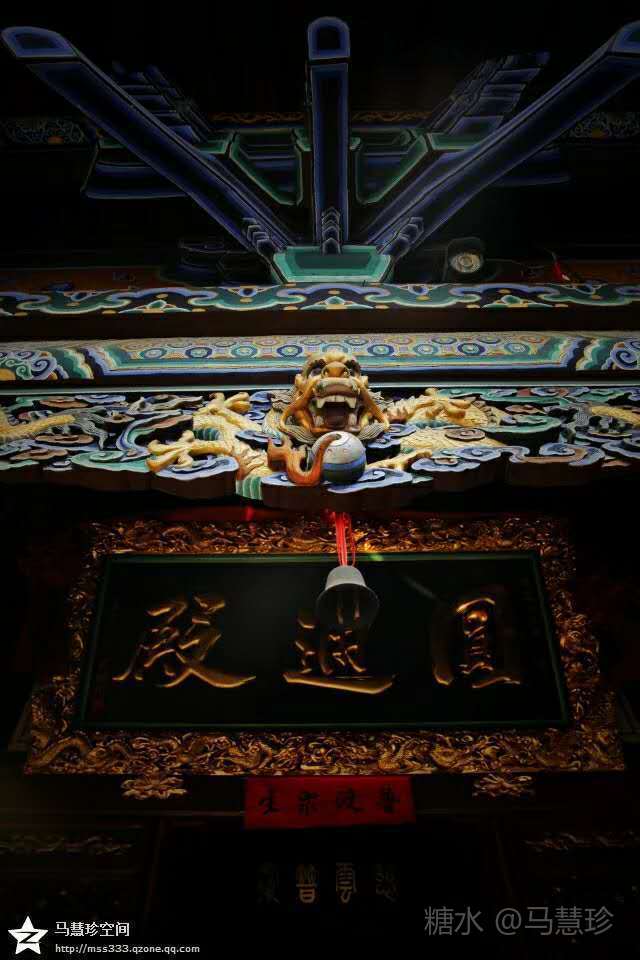 正殿主脊为楼阁宝顶,两头螭吻吞脊,头上是青狮白象驼宝瓶,寓指万象平安。
