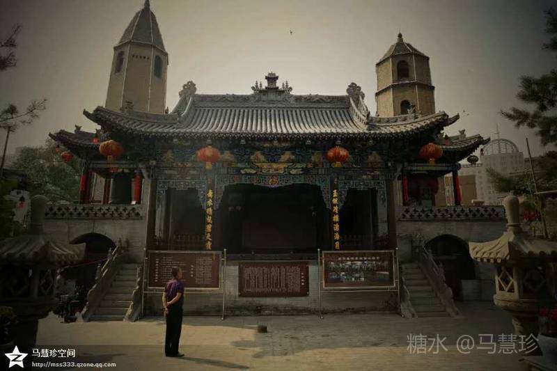 老戏台,面阔三间,进深三间,歇山顶,檐下斗栱三踩单下昂;双塔高处显露,分立两处肃穆庄严。