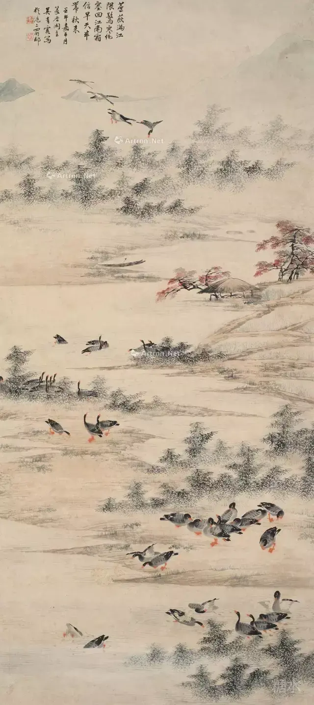 吴青霞自幼喜欢画芦雁。在父亲的指导下,认真临摹宋人芦雁范本和参悟画法。后来,尤喜清代边寿民画法,作品渐成一宗。但作为女性画家,她画的芦雁,情趣细腻;芦苇线条即见挺拔刚劲,又有风中摇曳婀娜多姿之势。芦雁纷落平沙,千姿百态,真可谓“气韵生动”。